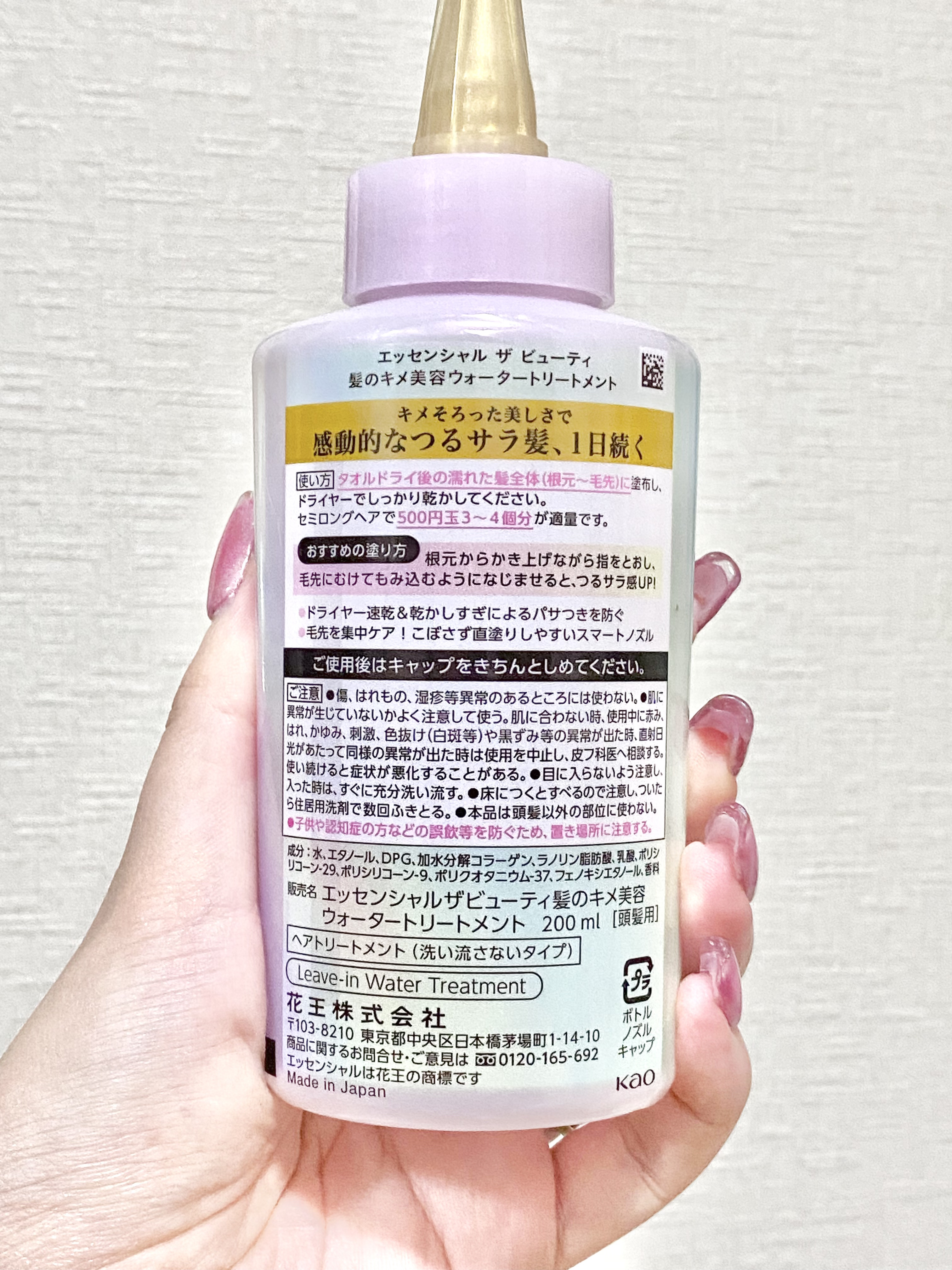 エッセンシャルプレミアムウォータートリートメントEXスムース参考価格¥1,414〜lipsプレゼントでいただきました🎁【使用感】使用感はシャバシャバで使いやすく、オイルでもなくミルクでもありません。手にとってから髪に塗布しても手がベタついたり...
