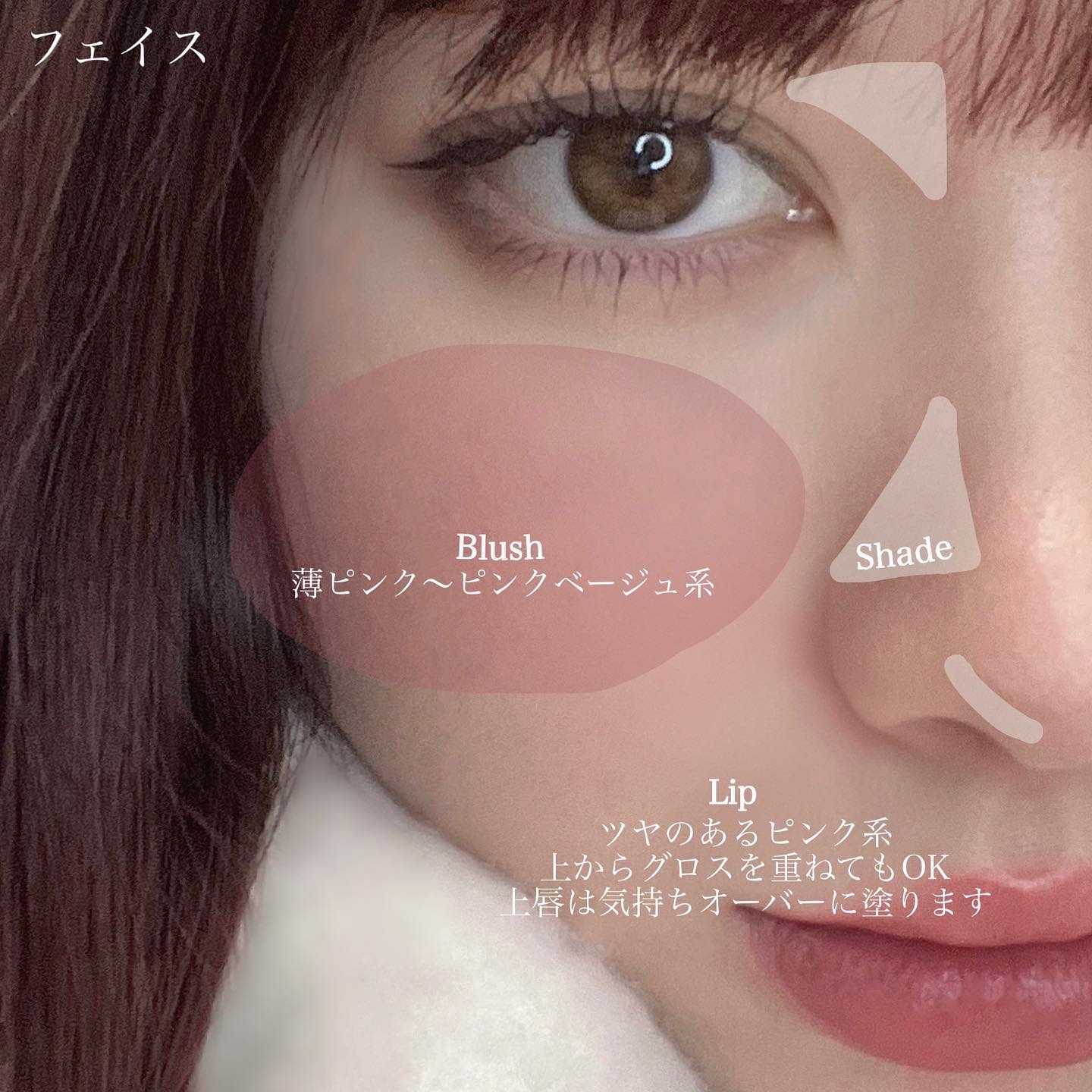 目の周りの3箇所は特にハイライトを部分的に入れることで光が入って顔全体がパッと明るくなるような気がします😗😗 本当はグロスを使いたいけどマスクに付いた時の不快感が嫌なのでサラサラ系のテクスチャーのティントがおすすめ▹▸宮脇咲良プロデュースのCran by Molakブルームジェリーティントは名前の通りジェルっぽい質感でツヤっとした仕上がりになるので良い◎ 顔の中心にはパウダーをのせずにファンデーションのツヤをそのままの残した方が太陽の光が当たった時自然な輝きが出て好き🙂輪郭は擦れでメイクが落ちやすいのでおでこも含めてしっかりパウダーで抑えます👌🏻(鼻周りが落ちやすい方はそこだけパウダーで抑えてもいいかも)
