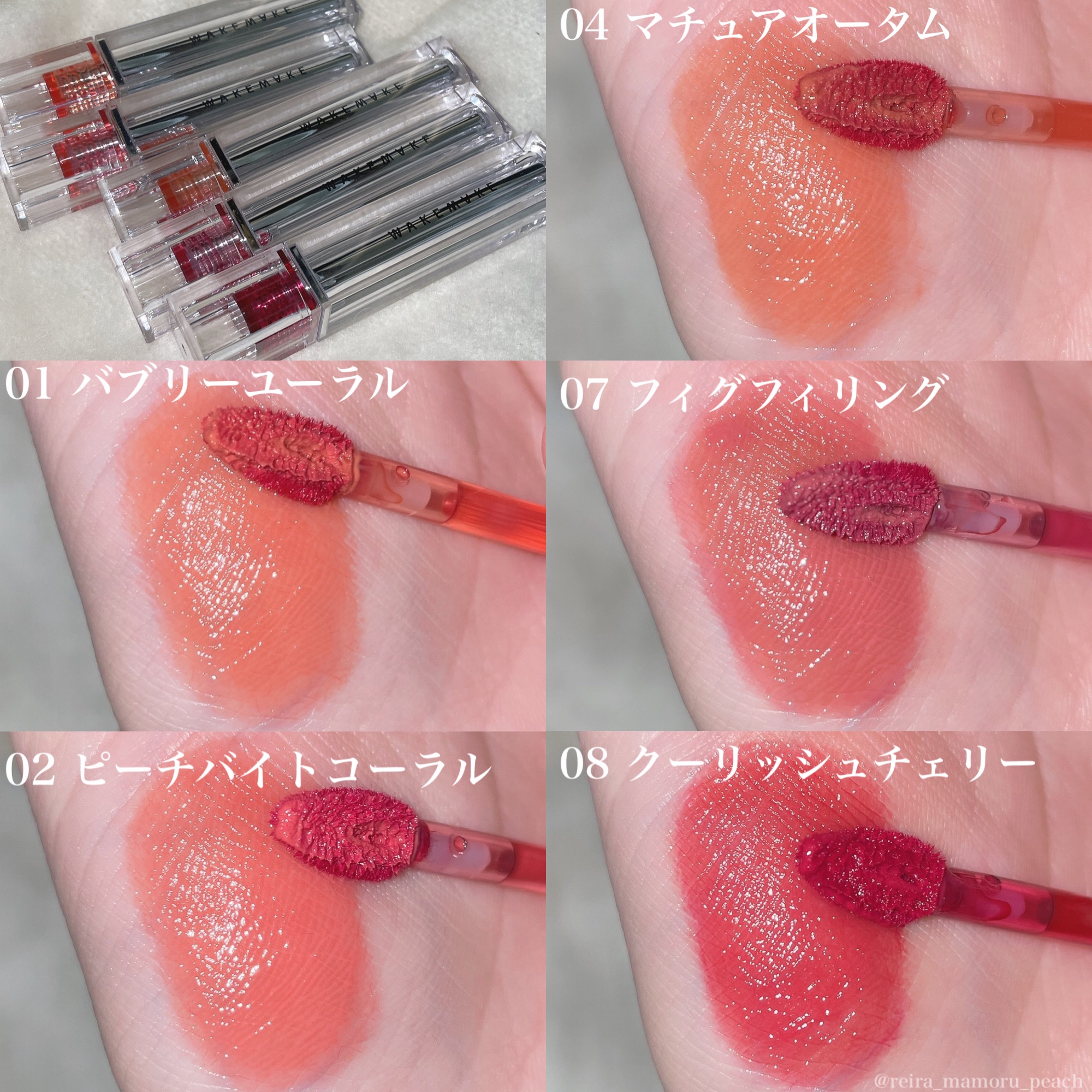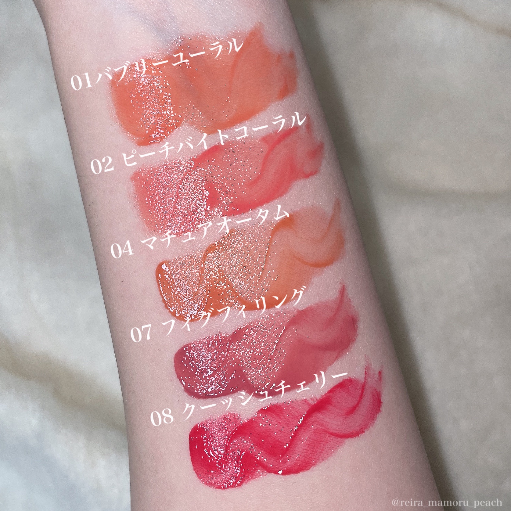 - <01 バブリーコーラル> 水、リンゴ酸ジイソステアリル、ビスジグリセリルポリアシルアジペート‐2、トリメチルシロキシフェニルジメチコン、水添ポリイソブテン、ポリフェニルシルセスキオキサン、ダイマージリノール酸ダイマージリノレイルビス(ベヘニル/イソステアリル/フィトステリル)、セチルPEG/PPG‐10/1ジメチコン、ジグリセリン、セテアレス‐20、1,2‐ヘキサンジオール、(アクリル酸ヒドロキシエチル/アクリロイルジメチルタウリンNa)コポリマー、ポリソルベート60、スクワラン、フェノキシエタノール、ベヘニルアルコール、酸化チタン、カプリリルグリコール、黄5、香料、赤227、イソステアリン酸ソルビタン、水酸化Al、ポリアクリル酸アンモニウム、黄4、BG、青1、ヤマザクラ花エキス、モクレン花エキス、ハス花エキス、ダマスクバラ花エキス、ホホバ種子油、月見草油、オリーブ果実油、テトラ(ジ‐t‐ブチルヒドロキシヒドロケイヒ酸)ペンタエリスリチル、アーモンド油、アンズ核油、アルガニアスピノサ核油、シア脂、ツバキ種子油、トリ(カプリル/カプリン酸)グリセリル、マンゴー果実エキス、カニナバラ果実エキス <02 ピーチバイトコーラル> 水、リンゴ酸ジイソステアリル、ビスジグリセリルポリアシルアジペート‐2、トリメチルシロキシフェニルジメチコン、水添ポリイソブテン、ポリフェニルシルセスキオキサン、ダイマージリノール酸ダイマージリノレイルビス(ベヘニル/イソステアリル/フィトステリル)、セチルPEG/PPG‐10/1ジメチコン、ジグリセリン、セテアレス‐20、1,2‐ヘキサンジオール、(アクリル酸ヒドロキシエチル/アクリロイルジメチルタウリンNa)コポリマー、ポリソルベート60、スクワラン、フェノキシエタノール、ベヘニルアルコール、酸化チタン、カプリリルグリコール、香料、黄4、赤227、イソステアリン酸ソルビタン、黄5、水酸化Al、ポリアクリル酸アンモニウム、赤218、BG、青1、ヤマザクラ花エキス、モクレン花エキス、ハス花エキス、ダマスクバラ花エキス、ホホバ種子油、月見草油、オリーブ果実油、テトラ(ジ‐t‐ブチルヒドロキシヒドロケイヒ酸)ペンタエリスリチル、アーモンド油、アンズ核油、アルガニアスピノサ核油、シア脂、ツバキ種子油、トリ(カプリル/カプリン酸)グリセリル、マンゴー果実エキス、カニナバラ果実エキス <03 チルアップコーラル> 精製水、リンゴ酸ジイソステアリル、ビスジグリセリルポリアシルアジペート-2、トリメチルシロキシフェニルジメチコン、水添ポリイソブテン、ポリフェニルシルセスキオキサン、ダイマージリノール酸ダイマージリノレイルビス(ベヘニル/イソステアリル/フィトステリル)、セチルPEG/PPG-10/1ダイメチコン、ジグリセリン、セテアレス-20、1,2-ヘキサンジオール、アクリル酸ヒドロキシエチル/ナトリウムアクリロイルジメチルタウリン酸共重合体ポリソルベート60、スクアラン、フェノキシエタノール、ベヘニルアルコール、酸化チタン、カプリリルグリコール、香料、黄色5 号、黄色4号、赤色227号、イソステアリン酸ソルビタン、赤色104号(1)、水酸化酸化アルミニウム、ポリアクリル酸アンモニウム溶液、BG、ブリリアントブルーFCF、ヤマザクラ花エキス、モクレン花エキス、ハス花エキス、ダマスクバラ花エキス、ホホバ種子油、月見草油、オリーブオイル、テトラジブチルヒドロキシヒドロケイヒ酸ペンタエリスリチル、アーモンド油、アンズ核油、アルガニアスピノサ核油、シア脂、ツバキ油、トリ(カプリル/カプリン酸)グリセリル、マンゴー果実エキス、カニナバラ果実エキス <04 マチュアオータム> 水、リンゴ酸ジイソステアリル、ビスジグリセリルポリアシルアジペート 2、トリメチルシロキシフェニルジメチコン、水添ポリイソブテン、ダイマージリノール酸ダイマージリノレイルビス(ベヘニル/イソステアリル/フィトステリル)、ポリフェニルシルセスキオキサン、セチルPEG/PPG 10/1ジメチコン、ジグリセリン、セテアレス 20、1,2 ヘキサンジオール、(アクリル酸ヒドロキシエチル/アクリロイルジメチルタウリンNa)コポリマー、ポリソルベート60、スクワラン、フェノキシエタノール、ベヘニルアルコール、カプリリルグリコール、グリセリン、酸化チタン、黄5、香料、赤227、イソステアリン酸ソルビタン、青1、赤218、BG、モクレン花エキス、ヤマザクラ花エキス、ハス花エキス、ダマスクバラ花エキス、ホホバ種子油、月見草油、オリーブ果実油、テトラ(ジtブチルヒドロキシヒドロケイヒ酸)ペンタエリスリチル、アーモンド油、アンズ核油、シア脂、ツバキ種子油、トリ(カプリル/カプリン酸)グリセリル、アルガニアスピノサ核油、マンゴー果実エキス、カニナバラ果実エキス <05 センシュアルレッド> 精製水、リンゴ酸ジイソステアリル、ビスジグリセリルポリアシルアジペート-2、トリメチルシロキシフェニルジメチコン、水添ポリイソブテン、ダイマージリノール酸ダイマージリノレイルビス(ベヘ