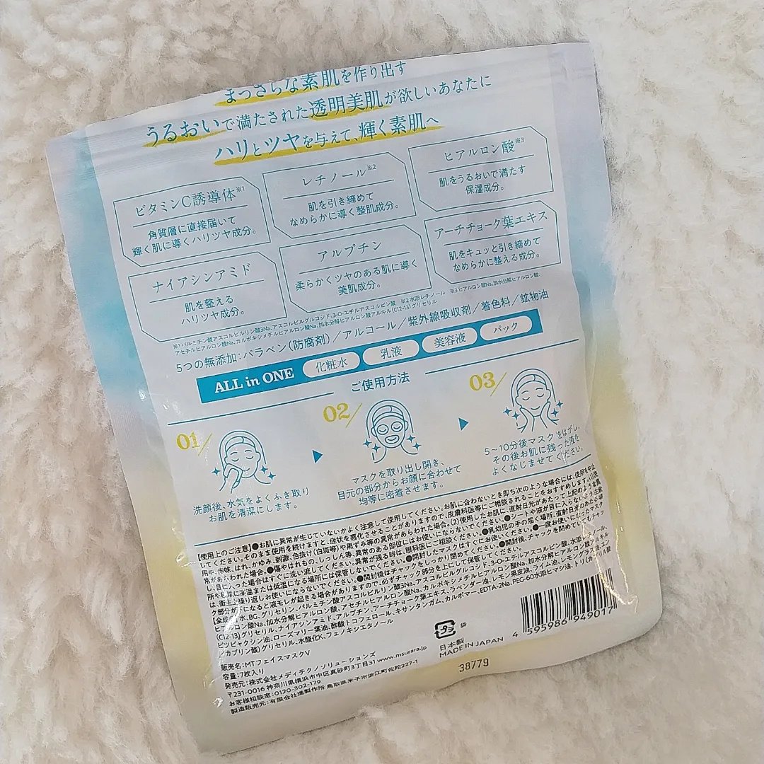 - ・ビタミンC誘導体*1を配合。毛穴*2ケアはもちろん、ハリ・弾力*3、ツヤ、キメ、透明感*2のあるクリアな肌印象へ導く。 ・肌リズムに着目して肌をなめらかに整えるレチノール。 ・角質層まで潤いをとどけるヒアルロン酸が配合されたスペシャルケア用のフェイスマク。 ・潤いとハリを与えるナイアシンアミドやアルブミン、肌をキュッと引き締めて整えるアーチチョーク葉エキスも配合。 ・防腐剤(パラベン)やエタノール、紫外線吸収剤、着色料、鉱物油は一切使用せず、「五つの無添加」を実現。 ・日本製シートを採用。 ・化粧水、乳液、美容液、パックALL IN ONE 時短ケアを実現。 *1パルミチン酸アスコルビルリン酸3Na、アスコルビルグルコシド、3-0-エチルアスコルビン酸 *2潤いによる *3肌をやわらげることによりお肌に弾力を与える