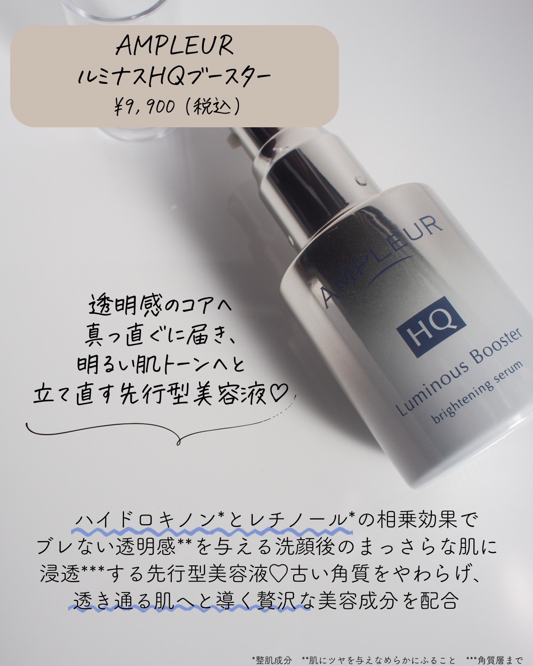 ルミナスHQブースターは気になるしつこいくすみを断ち切る先行型の美容液! 朝晩の洗顔後に2~3プッシュを手にとり、顔全体になじませることで、土台からくすみの元を断ち、ブレない透明感を引き出してくれるそう! ハイドロキノンとレチノールが配合されているなんて攻めてるな~と思いましたし、刺激を感じそうで心配でした💦 その後に化粧水を塗るといつもよりもちっとした仕上がりになった気がします!