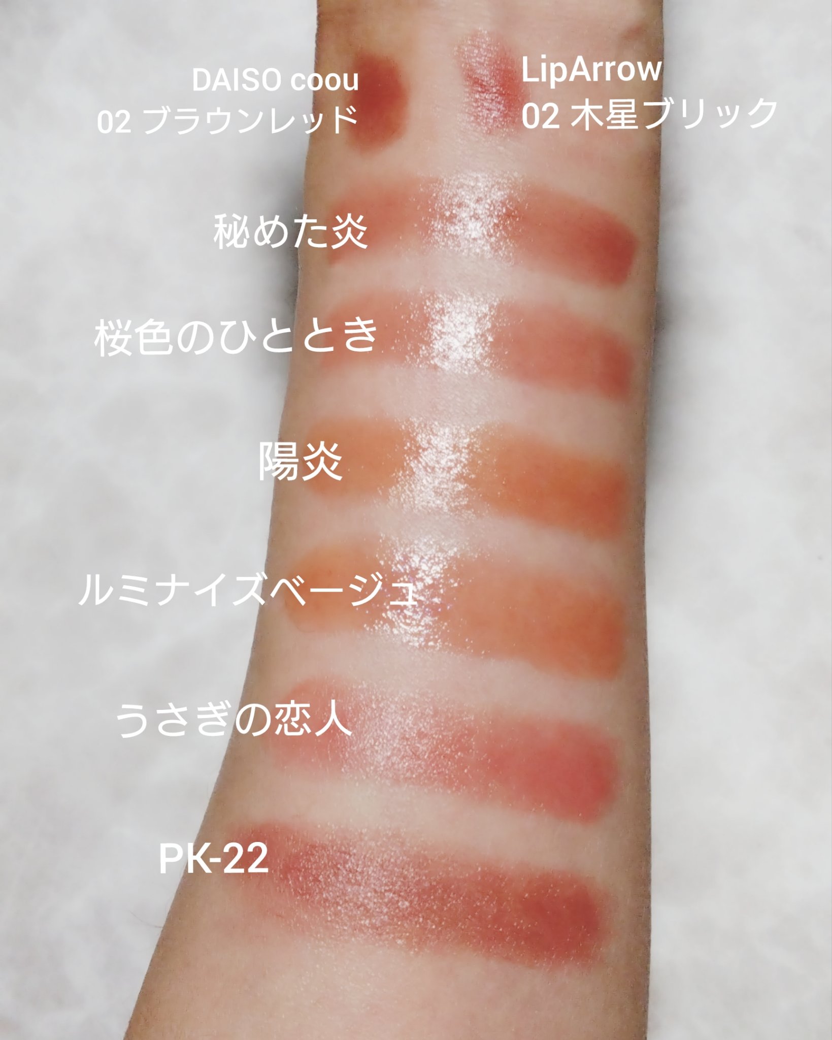 オールドピンクにさり気なく輝くグリーンパール 黄み過ぎず青み過ぎず、イエベさんにもブルベさんにも似合いそうな、優しい粘膜色の落ち着いたピンクです。 こちらも定番色の中でもしばらく人気が高く、入手が難しい時期が長かったでした。 どちらかというと黄み寄りの柔らかいコーラルピンクぽいです。 黄み寄りの柔らかいコーラルピンクにブルーパールがキラキラします。 青み寄りの明るめのピンクで、イエベ春さんやブルベさんに似合いそうです。 うさぎの恋人や秘めた炎をもっと青み寄りのオールドローズにしたカラー。 リップモンスター、オペラ リップティント Nが結構似てる透明感あるちゅるんとした発色でした。 ネンマクフェイク ルージュはもう少ししっかりしたテクスチャで、mediaはもっと肌にひっかかる感じのマットなテクスチャでした。