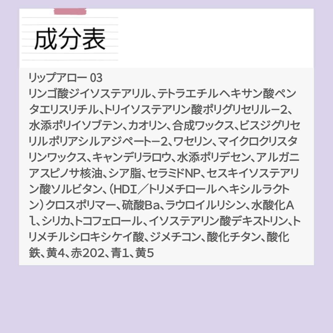 - <01 たまゆらベージュ> リンゴ酸ジイソステアリル、テトラエチルヘキサン酸ペンタエリスリチル、トリイソステアリン酸ポリグリセリル-2、水添ポリイソブテン、カオリン、合成ワックス、ビスジグリセリルポリアシルアジペート-2、ワセリン、マイクロクリスタリンワックス、キャンデリラロウ、水添ポリデセン、アルガニアスピノサ核油、シア脂、セラミドNP、セスキイソステアリン酸ソルビタン、(HDI/トリメチロールヘキシルラクトン)クロスポリマー、硫酸Ba、ラウロイルリシン、水酸化Al、シリカ、トコフェロール、イソステアリン酸デキストリン、トリメチルシロキシケイ酸、ジメチコン、酸化チタン、酸化鉄、黄5、黄4 <02 木星ブリック> リンゴ酸ジイソステアリル、テトラエチルヘキサン酸ペンタエリスリチル、トリイソステアリン酸ポリグリセリル-2、水添ポリイソブテン、カオリン、合成ワックス、ビスジグリセリルポリアシルアジペート-2、ワセリン、マイクロクリスタリンワックス、キャンデリラロウ、水添ポリデセン、アルガニアスピノサ核油、シア脂、セラミドNP、セスキイソステアリン酸ソルビタン、(HDI/トリメチロールヘキシルラクトン)クロスポリマー、硫酸Ba、ラウロイルリシン、水酸化Al、トコフェロール、シリカ、イソステアリン酸デキストリン、トリメチルシロキシケイ酸、ジメチコン、酸化チタン、酸化鉄、黄4、赤202、赤201 <07 杏仁アールグレイ> リンゴ酸ジイソステアリル、テトラエチルヘキサン酸ペンタエリスリチル、トリイソステアリン酸ポリグリセリル-2、水添ポリイソブテン、カオリン、合成ワックス、ビスジグリセリルポリアシルアジペート-2、ワセリン、マイクロクリスタリンワックス、キャンデリラロウ、水添ポリデセン、アルガニアスピノサ核油、シア脂、セラミドNP、セスキイソステアリン酸ソルビタン、(HDI/トリメチロールヘキシルラクトン)クロスポリマー、硫酸Ba、水酸化Al、シリカ、テトライソステアリン酸ポリグリセリル-2、ラウロイルリシン、トコフェロール、イソステアリン酸デキストリン、トリメチルシロキシケイ酸、ジメチコン、酸化チタン、酸化鉄、黄4、赤202、黄5 <09 ラズベリーミルク> リンゴ酸ジイソステアリル、テトラエチルヘキサン酸ペンタエリスリチル、トリイソステアリン酸ポリグリセリル-2、水添ポリイソブテン、カオリン、合成ワックス、ビスジグリセリルポリアシルアジペート-2、ワセリン、マイクロクリスタリンワックス、キャンデリラロウ、水添ポリデセン、アルガニアスピノサ核油、シア脂、セラミドNP、セスキイソステアリン酸ソルビタン、(HDI/トリメチロールヘキシルラクトン)クロスポリマー、硫酸Ba、水酸化Al、テトライソステアリン酸ポリグリセリル-2、ラウロイルリシン、トコフェロール、シリカ、イソステアリン酸デキストリン、トリメチルシロキシケイ酸、ジメチコン、酸化チタン、酸化鉄、黄5、赤202、黄4 <03 そよそよゴースト> リンゴ酸ジイソステアリル、テトラエチルヘキサン酸ペンタエリスリチル、トリイソステアリン酸ポリグリセリル-2、水添ポリイソブテン、カオリン、合成ワックス、ビスジグリセリルポリアシルアジペート-2、ワセリン、マイクロクリスタリンワックス、キャンデリラロウ、水添ポリデセン、アルガニアスピノサ核油、シア脂、セラミドNP、セスキイソステアリン酸ソルビタン、(HDI/トリメチロールヘキシルラクトン)クロスポリマー、硫酸Ba、ラウロイルリシン、水酸化Al、シリカ、トコフェロール、イソステアリン酸デキストリン、トリメチルシロキシケイ酸、ジメチコン、酸化チタン、酸化鉄、黄4、赤202、青1、黄5 <04 リスクテイカー> リンゴ酸ジイソステアリル、テトラエチルヘキサン酸ペンタエリスリチル、トリイソステアリン酸ポリグリセリル-2、水添ポリイソブテン、カオリン、合成ワックス、ビスジグリセリルポリアシルアジペート-2、ワセリン、マイクロクリスタリンワックス、キャンデリラロウ、水添ポリデセン、アルガニアスピノサ核油、シア脂、セラミドNP、セスキイソステアリン酸ソルビタン、(HDI/トリメチロールヘキシルラクトン)クロスポリマー、硫酸Ba、水酸化Al、ラウロイルリシン、シリカ、トコフェロール、イソステアリン酸デキストリン、トリメチルシロキシケイ酸、ジメチコン、酸化鉄、酸化チタン、黄4、青1、赤202 <05 アーチャークイーン> リンゴ酸ジイソステアリル、テトラエチルヘキサン酸ペンタエリスリチル、トリイソステアリン酸ポリグリセリル-2、水添ポリイソブテン、カオリン、合成ワックス、ビスジグリセリルポリアシルアジペート-2、ワセリン、マイクロクリスタリンワックス、キャンデリラロウ、水添ポリデセン、アルガニアスピノサ核油、シア脂、セラミドNP、セスキイソステアリン酸ソルビタン、(HDI/トリメチロールヘキシルラクトン)クロスポリマー、硫酸Ba、水酸化Al、ラウロイルリシン、シリカ、トコフェロール、イソステアリン酸デキストリン、