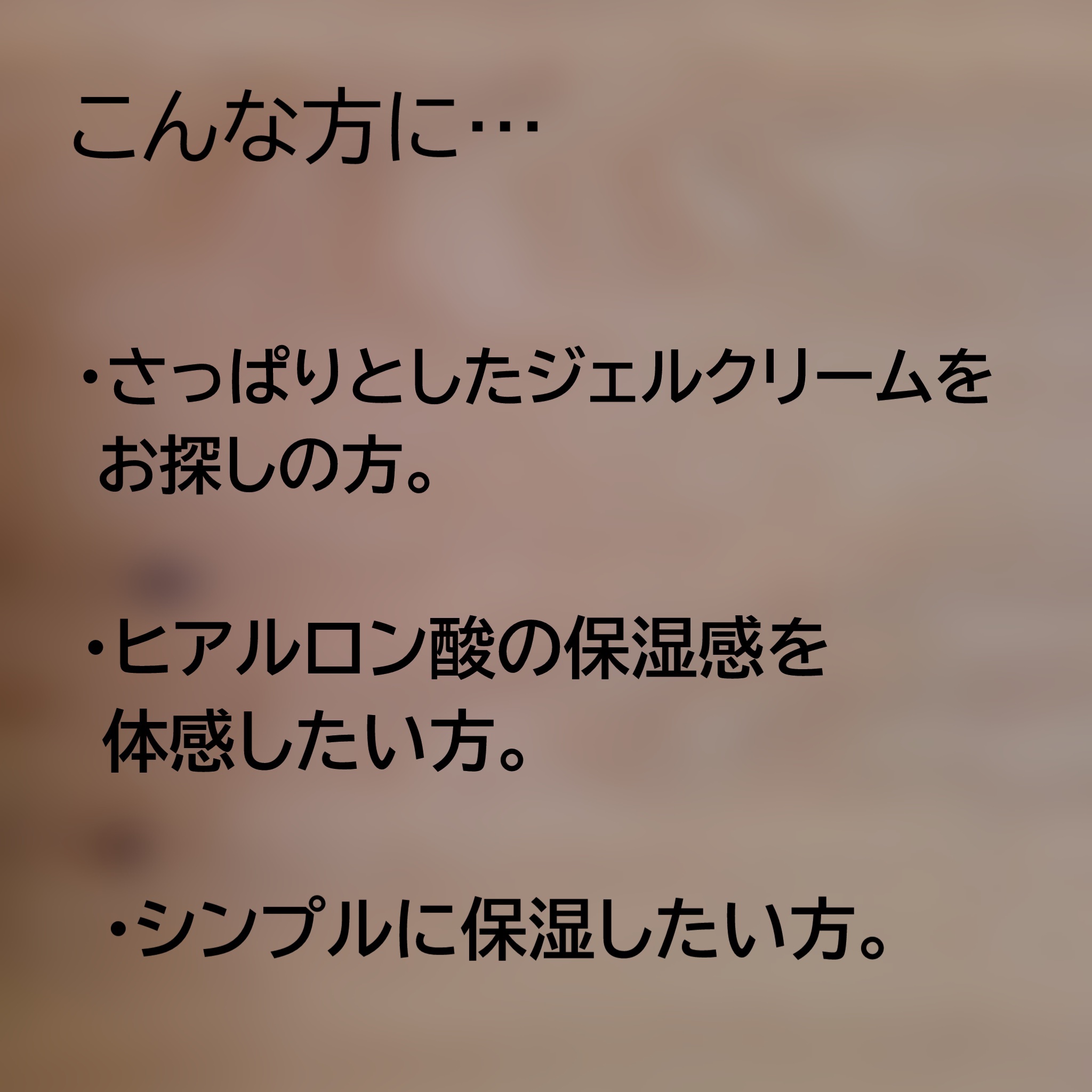 - <50g> 水、グリセリン、DPG、ジグリセリン、ペンチレングリコール、ヒアルロン酸Na、加水分解ヒアルロン酸、アセチルヒアルロン酸Na、乳酸球菌/ヒアルロン酸発酵液、BG、トリ(カプリル酸/カプリン酸)グリセリル、オレフィンオリゴマー、カルボマー、TEA、イソステアリン酸PEG-20ソルビタン、ステアリン酸グリセリル、安息香酸Na、ジメチコン、EDTA-2Na、ラウロイルグルタミン酸ジ(フィトステリル/オクチルドデシル)、ステアリルアルコール、ベヘニルアルコール、フェノキシエタノール