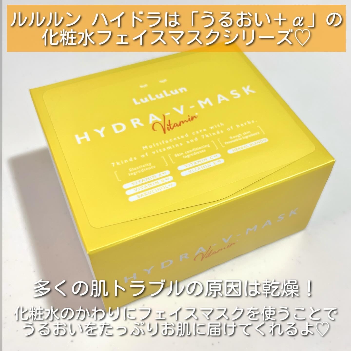 - ルルルンからビタミンたっぷりの化粧水フェイスマスクが新登場。 7種類のビタミン※1と7種類のハーブ※1で肌全体を素早くケア&集中肌メンテナンス。 新開発のフェイスラインに密着するシートで肌を引き締めながら肌のすみずみ※2までうるおいで満たし、毛穴の目立たないうるおいたっぷりの“水光肌”へ。 (※1 全て保湿成分として ※2 角質層まで)