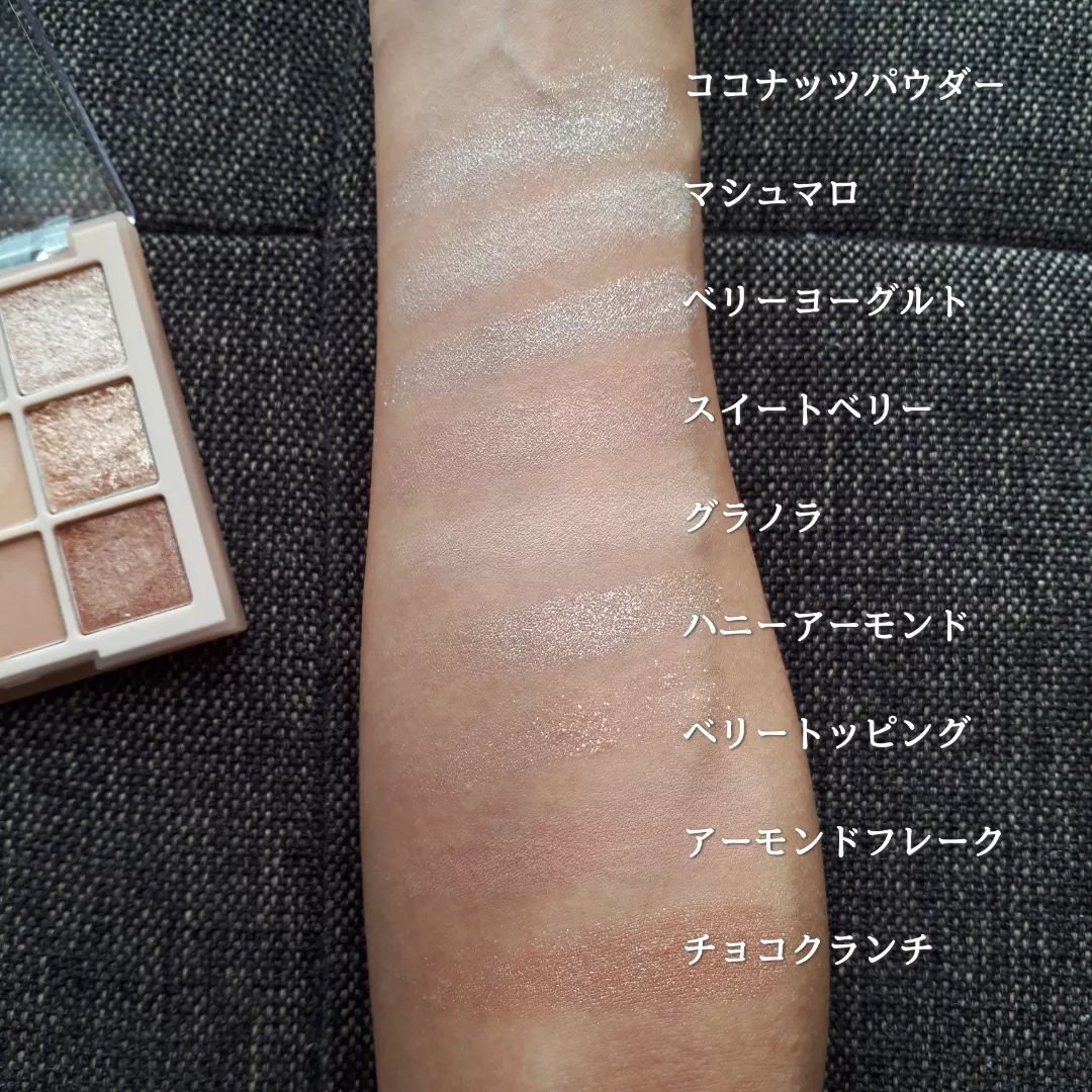 - <01 シュガーブラウニー> タルク、マイカ、ジメチコン、酸化鉄、ホウケイ酸(Ca/チタン)、イソドデカン、合成フルオロフロゴパイト、ホウケイ酸(Ca/Al)、酸化チタン、ステアロイルオキシステアリン酸オクチルドデシル、シリカ、フェニルトリメチコン、メタクリル酸メチルクロスポリマー、ジエチルヘキサン酸ネオペンチルグリコール、ミリスチン酸Mg、メチルプロパンジオール、ナイロン-12、(ビニルジメチコン/メチコンシルセスキオキサン)クロスポリマー、プロパンジオール、ステアリン酸Mg、ラウリン酸ヘキシル、(ジメチコン/ビニルジメチコン)クロスポリマー、マカデミア種子油、マンガンバイオレット、リンゴ酸ジイソステアリル、(ヘキシルデカン酸/セバシン酸)ジグリセリルオリゴエステル、ヘキサ(ヒドロキシステアリン酸/ステアリン酸/ロジン酸)ジペンタエリスリチル、セスキイソステアリン酸ソルビタン、テトラ(ヒドロキシステアリン酸/イソステアリン酸)ジペンタエリスリチル、ホウケイ酸(Ca/Na)、ステアリン酸ジメチコノール、トリエトキシカプリリルシラン、カルミン、サラソウジュ種子脂、ジフェニルシロキシフェニルトリメチコン、ジイソステアリン酸ポリグリセリル-3、黄4、赤226、合成ワックス、酸化スズ、グンジョウ、ラウロイルリシン、メチコン、水 <02 ローズペタル> タルク、マイカ、ジメチコン、ホウケイ酸(Ca/チタン)、酸化チタン、ホウケイ酸(Ca/Al)、合成フルオロフロゴパイト、酸化鉄、ナイロン-12、トリエチルヘキサノイン、シリカ、ホウケイ酸(Ca/Na)、メタクリル酸メチルクロスポリマー、ジエチルヘキサン酸ネオペンチルグリコール、ミリスチン酸Mg、フェニルトリメチコン、トリイソステアリン酸ポリグリセリル-2、ステアロイルオキシステアリン酸オクチルドデシル、ステアリン酸Mg、メチルプロパンジオール、オクチルドデカノール、マンガンバイオレット、赤226、リンゴ酸ジイソステアリル、ヘキサ(ヒドロキシステアリン酸/ステアリン酸/ロジン酸)ジペンタエリスリチル、プロパンジオール、ラウリン酸ヘキシル、マカデミア種子油、イソステアリン酸水添ヒマシ油、(ジメチコン/ビニルジメチコン)クロスポリマー、窒化ホウ素、カルミン、(ヘキシルデカン酸/セバシン酸)ジグリセリルオリゴエステル、ネオペンタン酸イソステアリル、グンジョウ、セスキイソステアリン酸ソルビタン、(HDI/トリメチロールヘキシルラクトン)クロスポリマー、ポリブテン、酸化スズ、トリエトキシカプリリルシラン、フェノキシエタノール、ラウロイルリシン、ステアリン酸ジメチコノール、合成ワックス、黄5、黄4、水添レシチン、メチコン、コンジョウ、水 <03 ヌードポーション> タルク、マイカ、ポリブチレンテレフタレート、ビスジグリセリルポリアシルアジペート-2、ジメチコン、ホウケイ酸(Ca/チタン)、ホウケイ酸(Ca/Al)、シリカ、酸化チタン、アクリレーツコポリマー、(エチレン/VA)コポリマー、酸化鉄、合成フルオロフロゴパイト、ナイロン-12、トリイソステアリン酸ポリグリセリル-2、イソドデカン、ホウケイ酸(Ca/Na)、ステアロイルオキシステアリン酸オクチルドデシル、フェニルトリメチコン、マンガンバイオレット、メチルプロパンジオール、オクチルドデカノール、メタクリル酸メチルクロスポリマー、プロパンジオール、ヘキサ(ヒドロキシステアリン酸/ステアリン酸/ロジン酸)ジペンタエリスリチル、マカデミア種子油、リンゴ酸ジイソステアリル、ミリスチン酸Mg、ステアリン酸ジメチコノール、ステアリン酸Mg、ジエチルヘキサン酸ネオペンチルグリコール、トリエトキシカプリリルシラン、水添レシチン、ラウリン酸ヘキシル、カルミン、(ジメチコン/ビニルジメチコン)クロスポリマー、(ヘキシルデカン酸/セバシン酸)ジグリセリルオリゴエステル、セスキイソステアリン酸ソルビタン、酸化スズ、フェノキシエタノール、合成ワックス、メチコン、黄4、グンジョウ、水 <09 スイートシリアル> タルク、ホウケイ酸(Ca/チタン)、マイカ、酸化チタン、ホウケイ酸(Ca/Al)、ホウケイ酸(Ca/Na)、ビスジグリセリルポリアシルアジペート-2、合成フルオロフロゴパイト、オクテニルコハク酸デンプンAl、フェニルトリメチコン、窒化ホウ素、トリ(カプリル酸/カプリン酸)グリセリル、ポリブチレンテレフタレート、ナイロン-12、ステアロイルオキシステアリン酸オクチルドデシル、トリイソステアリン酸ポリグリセリル-2、酸化鉄、ミリスチン酸Mg、アクリレーツコポリマー、ジメチコン、メチルプロパンジオール、シリカ、ステアリン酸Mg、(エチレン/VA)コポリマー、ジエチルヘキサン酸ネオペンチルグリコール、ヘキサ(ヒドロキシステアリン酸/ステアリン酸/ロジン酸)ジペンタエリスリチル、プロパンジオール、(ジフェニルジメチコン/ビニルジフェニルジメチコン/シルセスキオキサン)クロスポリマー、リンゴ酸ジイソステアリル、ポリブテン、メタクリル酸メチルクロスポリマー、ステ