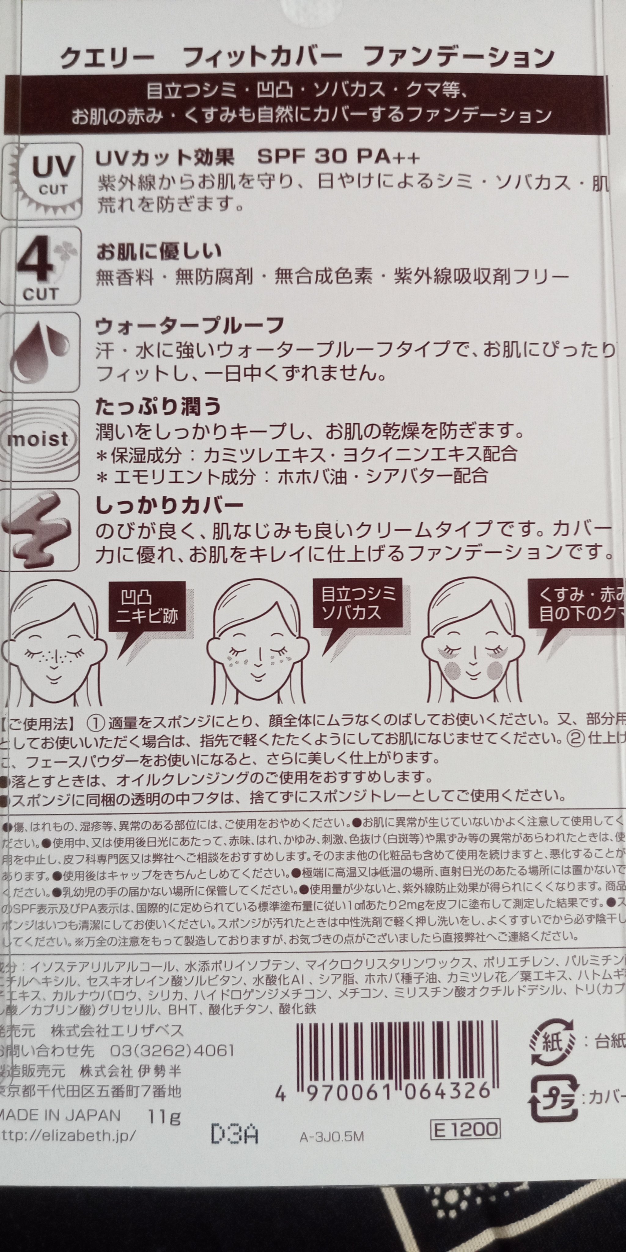 - カバー力と、フィット感の良いクリームタイプファンデーションなので、お肌の気になる部分をしっかりカバーします。 汗・水に強いウォータープルーフタイプで、お肌にフィットし、くずれにくい。 ・カミツレエキス、ヨクイニンエキス(保湿成分)とホホバ油、シアバター(エモリエント成分)配合。 ・無香料・無防腐剤・無合成色素・紫外線吸収剤不使用 ・SPF 30 PA++