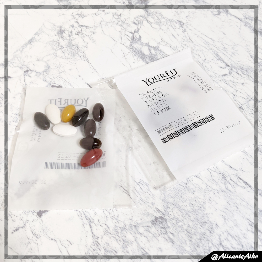 簡単なアンケートに答えていくだけで、自分の栄養状態(なにが不足してる・なにを摂取し過ぎてる)を分析して1人1人違うサプリメントを組み合わせてオリジナルのものを紹介してくれます。 実際に届いたものは1日分ずつ包装されているので、数種類飲むのに手軽で時短でした! サプリを数種類飲むときに、いくつもボトルやパウチを開け締めするのは面倒だったので「YOURFIT」は良かったです😊 1つ1つの効能が詳しく説明されていたり、アンケートに基づいた生活習慣や食についてのアドバイスもしてくれるのが勉強になりました。