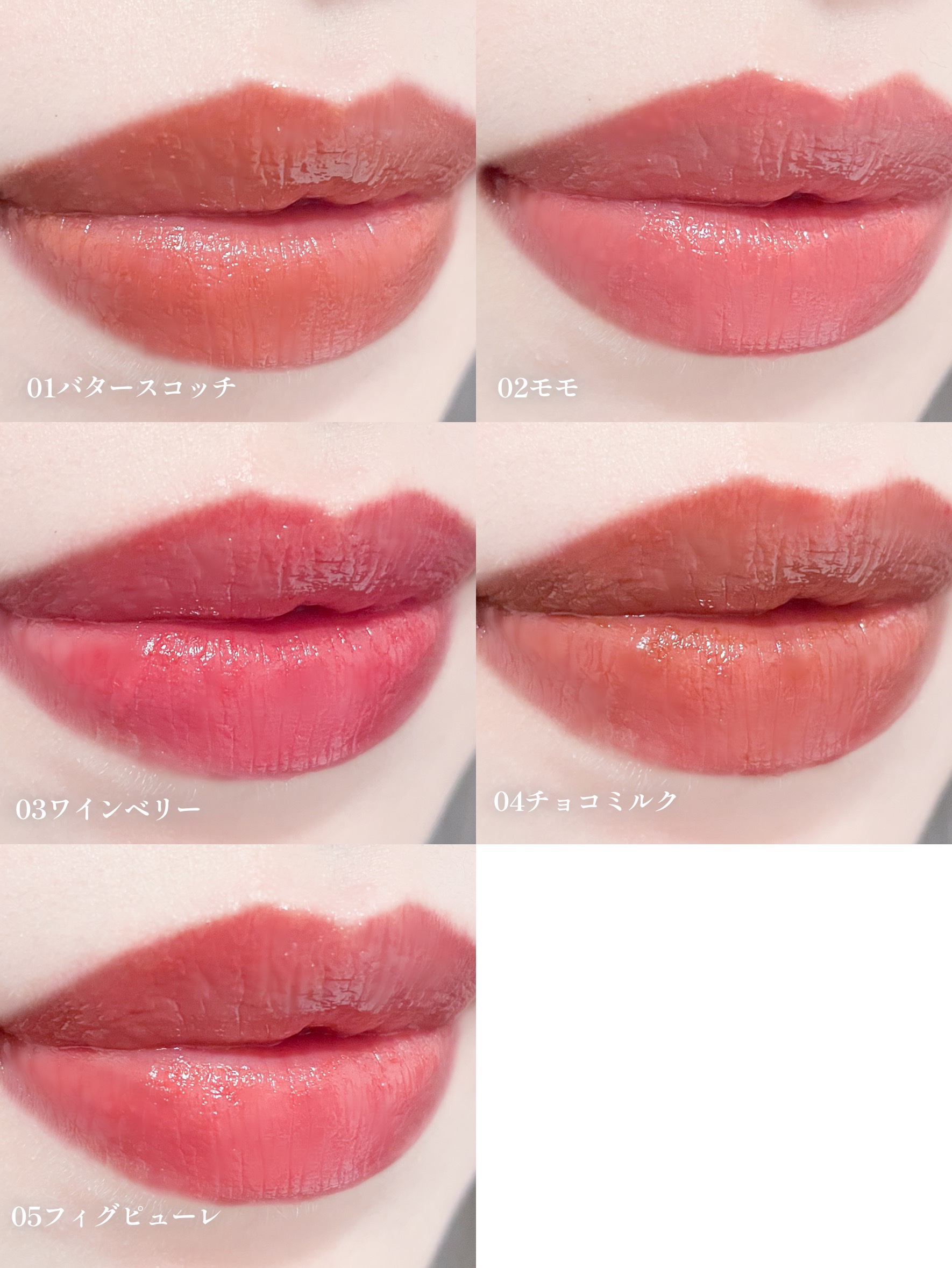 - <01 バタースコッチ> 水添ポリイソブテン、トリエチルヘキサノイン、ビスジグリセリルポリアシルアジペート-2、ヒドロキシステアリン酸エチルヘキシル、ワセリン、リンゴ酸ジイソステアリル、マイクロクリスタリンワックス、合成ワックス、シリカ、セスキイソステアリン酸ソルビタン、メントキシプロパンジオール、キャンデリラロウ、バニリルブチル、トコフェロール、クエン酸、クエン酸Na、ヒアルロン酸Na、アルガニアスピノサ核油、ハチミツ、シア脂、水、BG、加水分解コラーゲン、酸化鉄、酸化チタン、黄4、黄5、赤202、橙201、テトライソステアリン酸ポリグリセリル-2、青1、水酸化Al、赤223 <02 モモ> 水添ポリイソブテン、トリエチルヘキサノイン、ビスジグリセリルポリアシルアジペート-2、ヒドロキシステアリン酸エチルヘキシル、ワセリン、リンゴ酸ジイソステアリル、マイクロクリスタリンワックス、合成ワックス、シリカ、セスキイソステアリン酸ソルビタン、メントキシプロパンジオール、キャンデリラロウ、バニリルブチル、トコフェロール、クエン酸、クエン酸Na、ヒアルロン酸Na、アルガニアスピノサ核油、ハチミツ、シア脂、水、BG、加水分解コラーゲン、酸化チタン、黄4、黄5、赤202、酸化鉄、橙201、水酸化Al、テトライソステアリン酸ポリグリセリル-2 <03 ワインベリー> 水添ポリイソブテン、トリエチルヘキサノイン、ビスジグリセリルポリアシルアジペート-2、ヒドロキシステアリン酸エチルヘキシル、ワセリン、リンゴ酸ジイソステアリル、マイクロクリスタリンワックス、合成ワックス、シリカ、セスキイソステアリン酸ソルビタン、メントキシプロパンジオール、キャンデリラロウ、バニリルブチル、トコフェロール、クエン酸、クエン酸Na、ヒアルロン酸Na、アルガニアスピノサ核油、ハチミツ、シア脂、水、BG、加水分解コラーゲン、黄4、赤202、酸化チタン、酸化鉄、橙201、黄5、テトライソステアリン酸ポリグリセリル-2、赤223、水酸化Al、青1 <05 フィグピューレ> 水添ポリイソブテン、トリエチルヘキサノイン、ビスジグリセリルポリアシルアジペート-2、ヒドロキシステアリン酸エチルヘキシル、ワセリン、リンゴ酸ジイソステアリル、マイクロクリスタリンワックス、合成ワックス、シリカ、セスキイソステアリン酸ソルビタン、メントキシプロパンジオール、キャンデリラロウ、バニリルブチル、トコフェロール、クエン酸、クエン酸Na、ヒアルロン酸Na、アルガニアスピノサ核油、ハチミツ、シア脂、水、BG、加水分解コラーゲン、酸化チタン、黄4、赤202、黄5、酸化鉄、橙201、青1、水酸化Al、テトライソステアリン酸ポリグリセリル-2、赤223 <06 ラズベリーケーキ> 水添ポリイソブテン、トリエチルヘキサノイン、ビスジグリセリルポリアシルアジペート-2、ヒドロキシステアリン酸エチルヘキシル、リンゴ酸ジイソステアリル、ワセリン、マイクロクリスタリンワックス、合成ワックス、シリカ、セスキイソステアリン酸ソルビタン、メントキシプロパンジオール、キャンデリラロウ、バニリルブチル、トコフェロール、クエン酸、クエン酸Na、ヒアルロン酸Na、アルガニアスピノサ核油、ハチミツ、シア脂、水、BG、加水分解コラーゲン、酸化チタン、酸化鉄、赤202、橙201、水酸化Al、テトライソステアリン酸ポリグリセリル-2、青1、赤223、黄5 <07 フルーツオレ> 水添ポリイソブテン、トリエチルヘキサノイン、ビスジグリセリルポリアシルアジペート-2、ヒドロキシステアリン酸エチルヘキシル、ワセリン、リンゴ酸ジイソステアリル、マイクロクリスタリンワックス、合成ワックス、シリカ、セスキイソステアリン酸ソルビタン、メントキシプロパンジオール、キャンデリラロウ、バニリルブチル、トコフェロール、クエン酸、クエン酸Na、ヒアルロン酸Na、アルガニアスピノサ核油、ハチミツ、シア脂、水、BG、加水分解コラーゲン、酸化チタン、酸化鉄、黄4、水酸化Al、赤202、橙201、黄5、青1、テトライソステアリン酸ポリグリセリル-2 <04 チョコミルク> 水添ポリイソブテン、トリエチルヘキサノイン、ビスジグリセリルポリアシルアジペート-2、ヒドロキシステアリン酸エチルヘキシル、リンゴ酸ジイソステアリル、ワセリン、マイクロクリスタリンワックス、合成ワックス、シリカ、セスキイソステアリン酸ソルビタン、メントキシプロパンジオール、キャンデリラロウ、バニリルブチル、トコフェロール、クエン酸、クエン酸Na、ヒアルロン酸Na、アルガニアスピノサ核油、ハチミツ、シア脂、水、BG、加水分解コラーゲン、酸化鉄、青1、酸化チタン、橙201、赤202、テトライソステアリン酸ポリグリセリル-2、黄4、水酸化Al