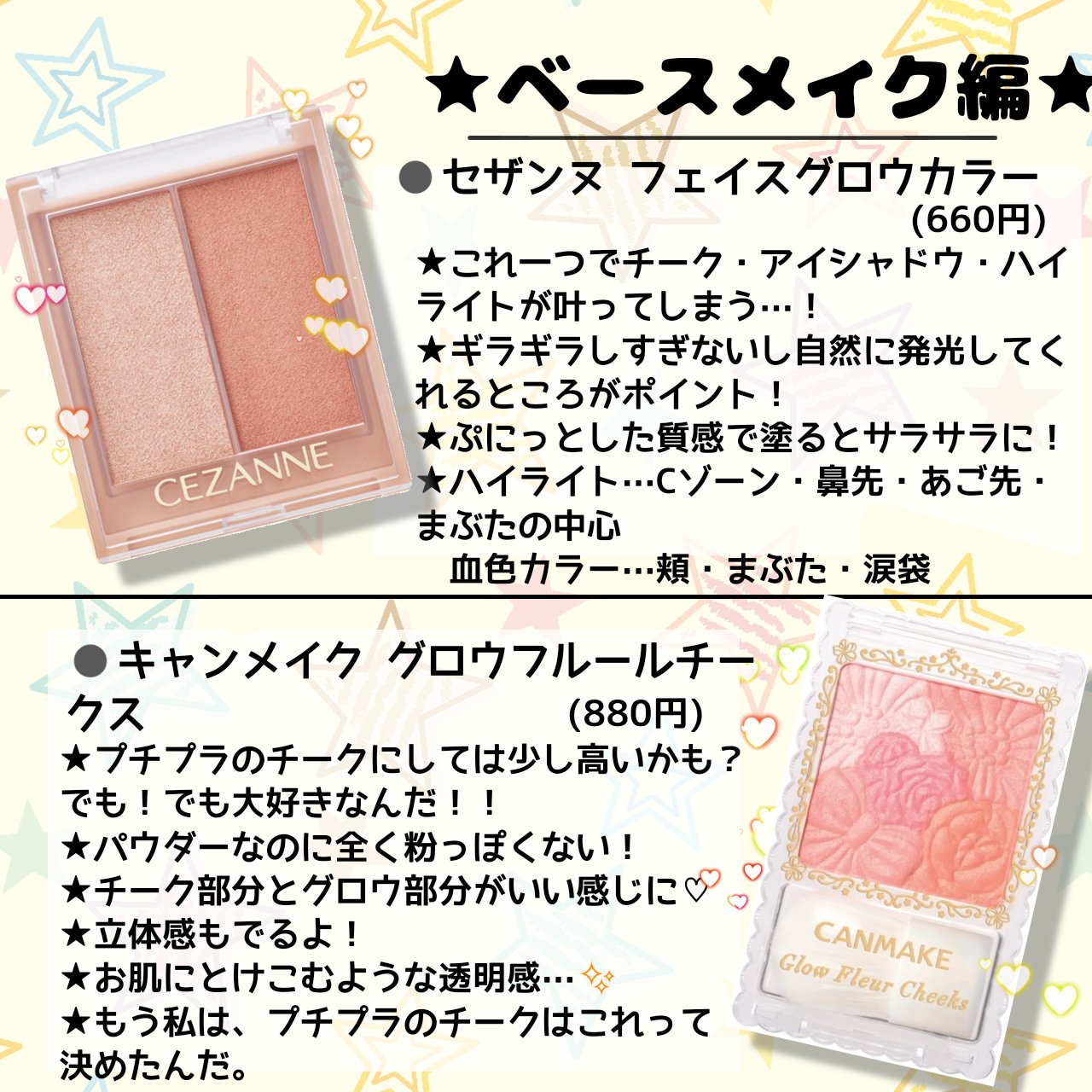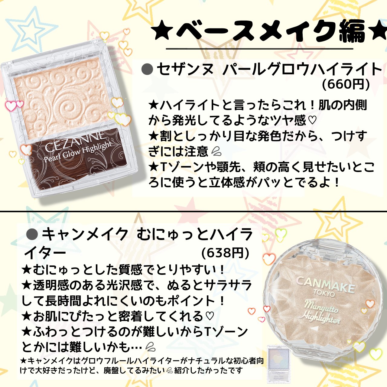 コンシーラーはキャンメイクのカラーミキシングコンシーラーがオススメです!!! ハイライト涙袋に入れるとめちゃぷっくりします! 小鼻の影消すと鼻ちっちゃくなります! ファンデーションはあえて紹介しなかったのですが、私のイチオシはティルティルのクッションファンデ。 その中でも"黒"が1番初心者向けです。 かなーりナチュラルにつくのでムラがなく、また少しカバー力もあるのでよく使ってます。 ミニサイズは少し安く売っているのでぜひ!