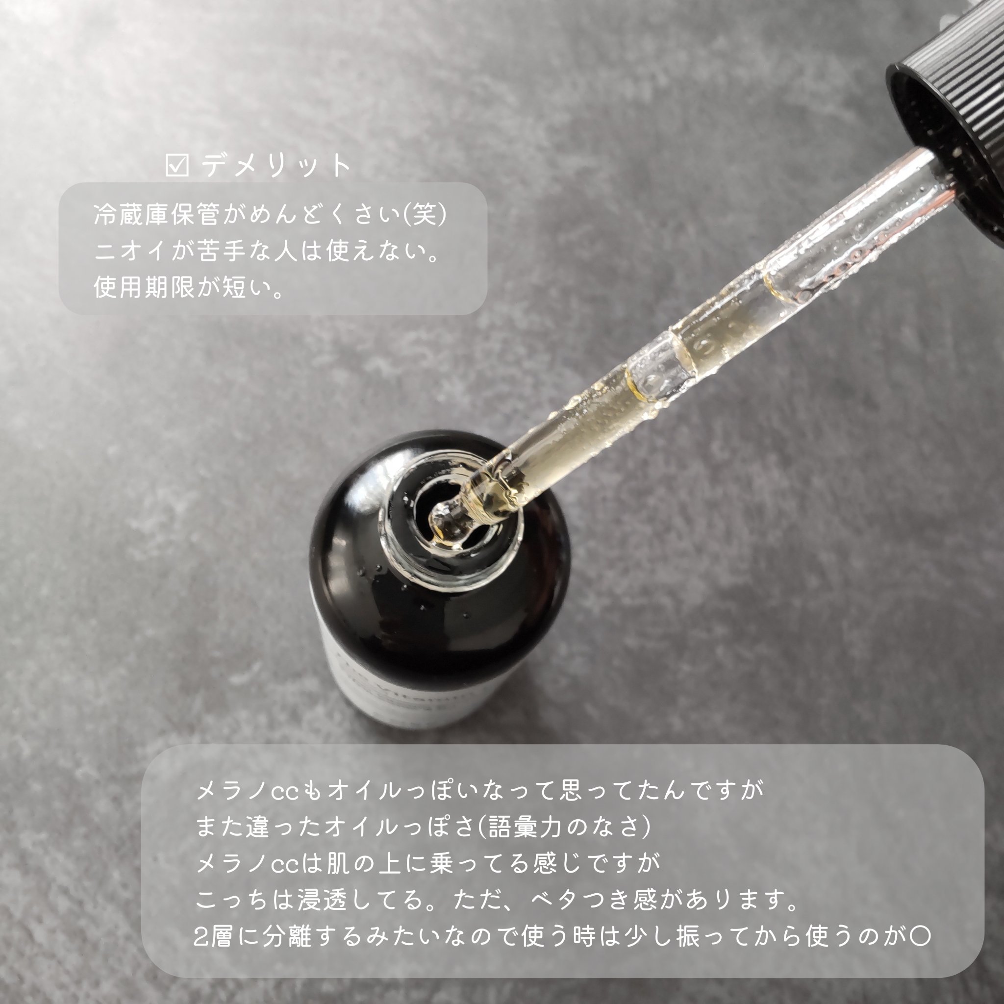 トロみのあるテクスチャーで スッと馴染みますが、 ベタつきは残るかと思います。 30mlですが、少量で伸びるので コスパはかなりいいかなーと 思うのですが容器が茶色なので 減りがわからないのが残念(笑) アゼライン酸の後に シカ成分の美容液を使用していたので それが刺激を抑えてくれていたのかも しれません。