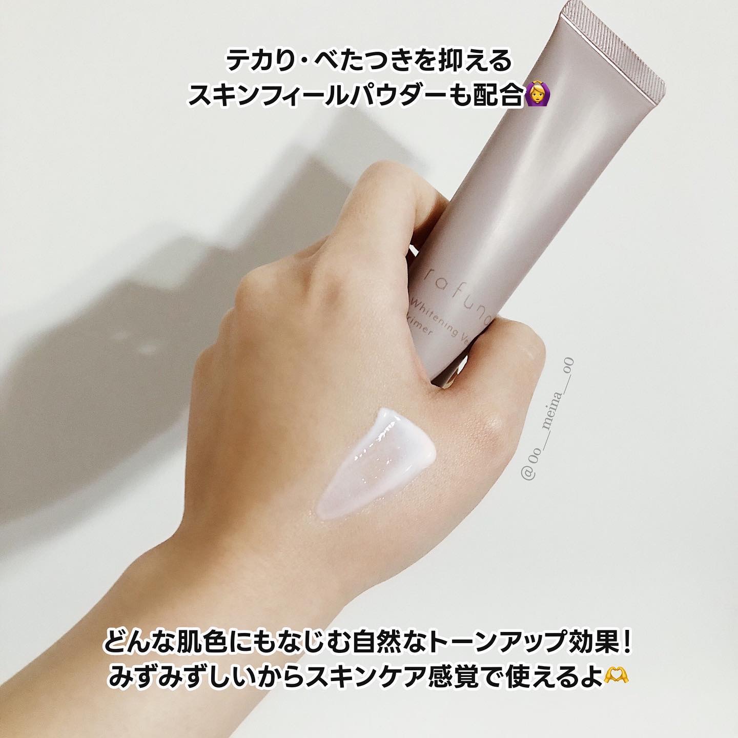 肌にとけこむ自然な輝き。 「美白×UVカット」を両立した美白プライマー。 みずみずしくサラッとしたテクスチャで自然なツヤ感を演出。のびがよく、スキンケアをしているような感覚で均一に塗布できます。 不思議と肌色に馴染んでワントーン肌色明るくなりました! 白浮きは全くしません。