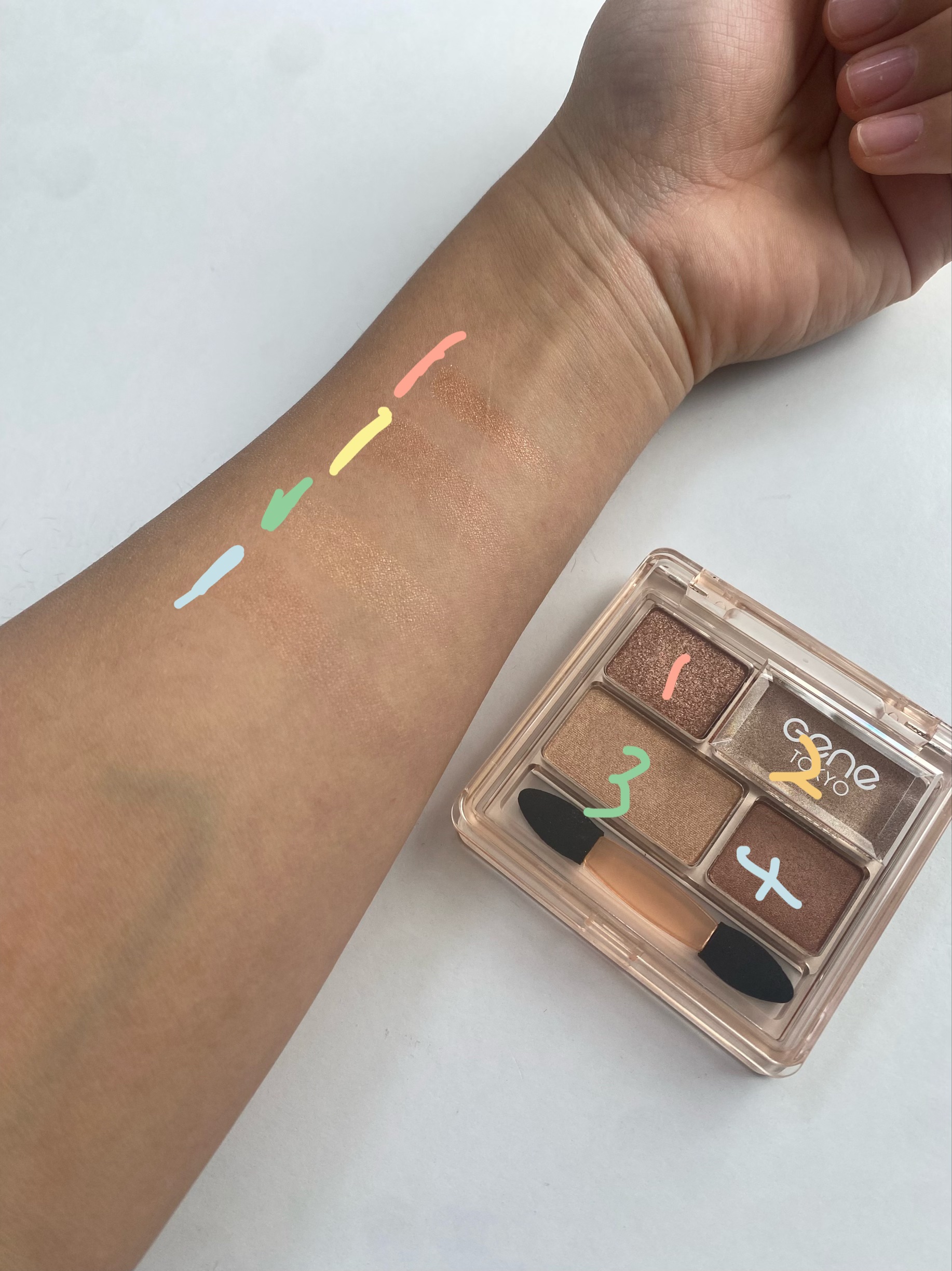 1、今回はaZTKのアイシャドウを紹介します!色はマット×1ラメ×3合計4色となっています2、3、1はベースの色という感じでベージュの色です2はラメラメという感じのラメです3はマットトラメの中間という感じでわたし的には1番使いやすい色です4色...