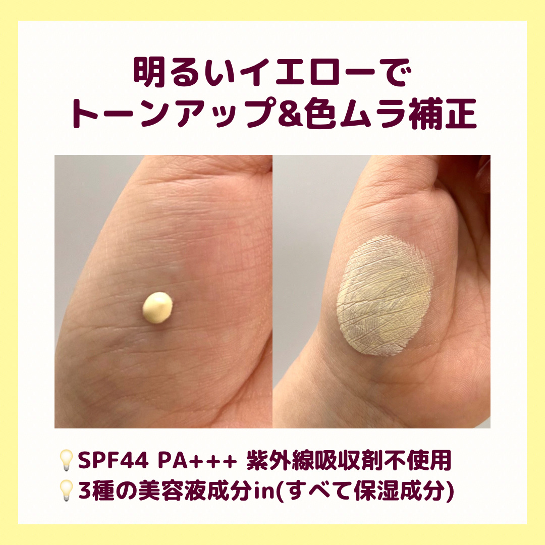 ファンデ要らずの圧倒的補正力! ✔️SPF44 +++ ✔️紫外線吸収剤不使用 ✔️3種の美容液成分配合 カバー力はかなり高く、赤みや色むらを均一に整えて肌を綺麗にトーンアップしてくれます◎ セミマットで少しさらっとした仕上がりです ナチュラルで薄づき、というよりはしっかりメイクをしている感が出やすいです