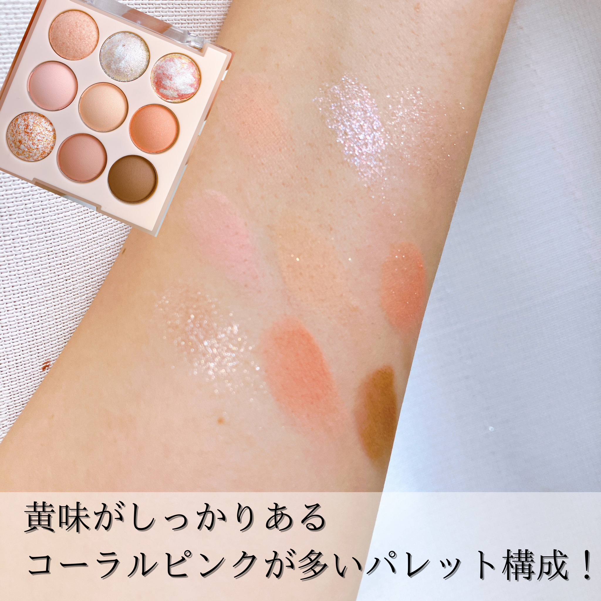 このパレットは黄味がしっかり入ったピーチコーラルカラー💕 目元に乗せるとパッと明るく馴染むところがお気に入りです🍑 3色入っているラメも異なる輝きで気分に合わせて使える🙆♀️ 特に私のお気に入りラメは左下のポプシクルというお名前がついたカラー😊 ゴールド系の輝きで1番肌馴染みが良くて使いやすい!!!