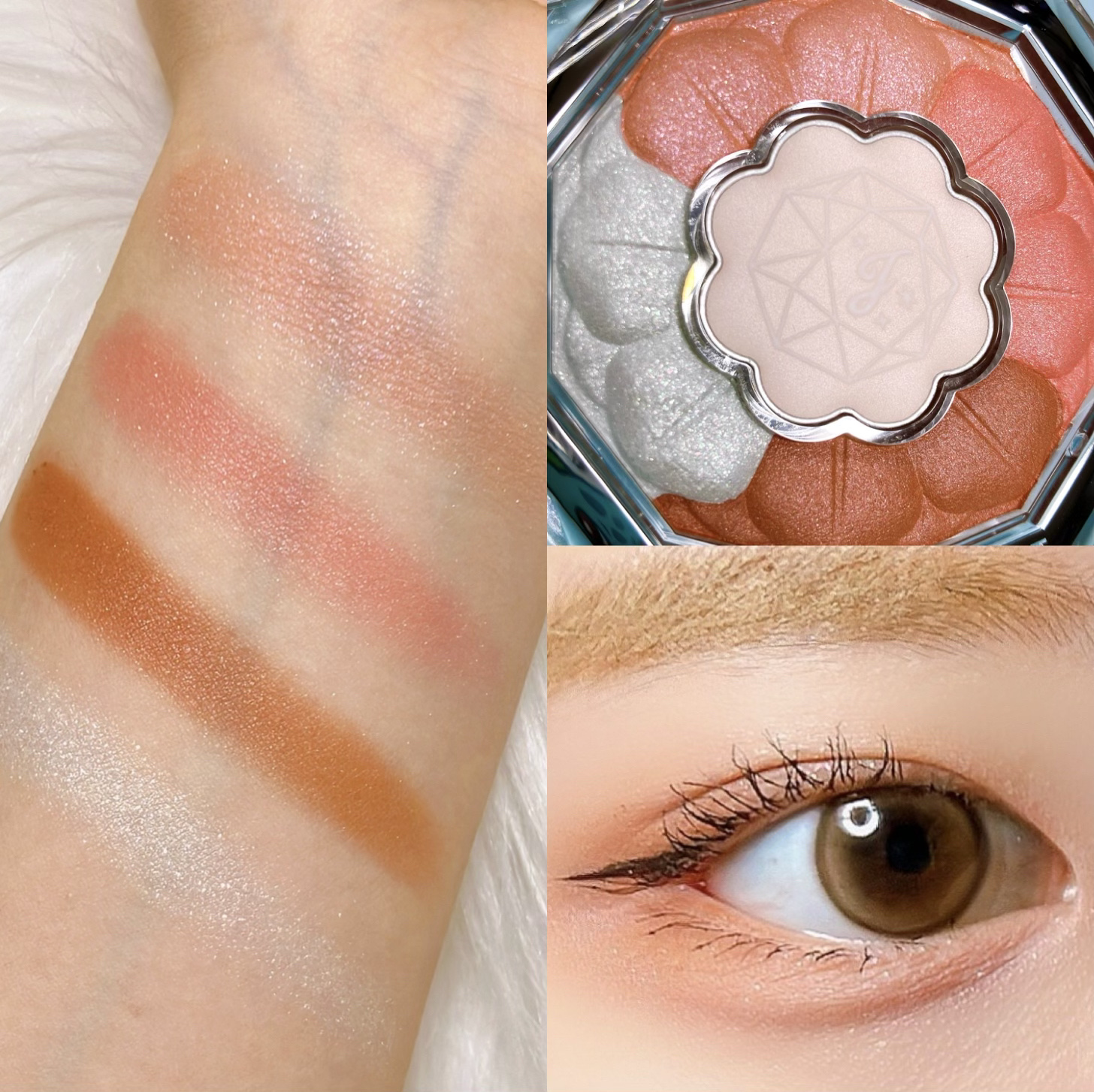 マットはかなりくすんだ色で、暗めのメイクに仕上がりがちに🤎 ツヤ感が大事だと言われるイエベ春でも、スモーキーメイク出来るんだ…!と思わせてくれたパレット。 愛して止まないミルクラテ、絶妙な柔らかベージュに透明感たっぷりのラメ✨️ 全色ラメ入りですが、真ん中2色のくすみと黄みが強く、どんよりした目元に…🥲 コーラルは大好きなんですが、このパレットは3滴白みを足したような色で、発色も弱くまぶたにも乗りづらく、かなり色白さんでないと使えない気がします…🥲 手持ちの中で1番黄み強いですが、1番完成度の高いです💕