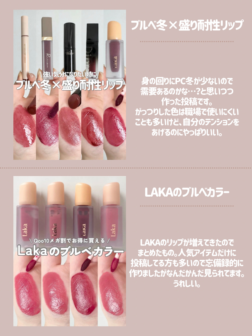 ネイチャーリパブリックハニーメルティングリッププラムワイン韓国で売り切れたらしい幻リップ。リップバーム系の使い心地では珍しい深みあるカラー。 Viséeネンマクフェイク ルージュRD450 金魚の恥らいLIPSでもベスコス受賞のアイテム👑金魚の恥らいは深みあるカラーなのに何故か顔の雰囲気にも馴染む。 Lakaフルーティーグラムティント115 エンヴィ最近はプラザ等店頭でも購入しやすくなった韓国コスメ。エンヴィは芳醇な果実のようなジューシーだけど大人っぽさもあるカラー。 Ririmewセンシュアルフィックスティント02 クラシカルプラム発売当初は即完&完売を繰り返してたアイテム。むちっとプラムカラーがブルベ冬にぴったり。 Dintoブラーグロイリップティント284 メメントモリ絶妙なカラーが特徴のDinto。メメントモリは中でもハッとするような印象的なレッド。