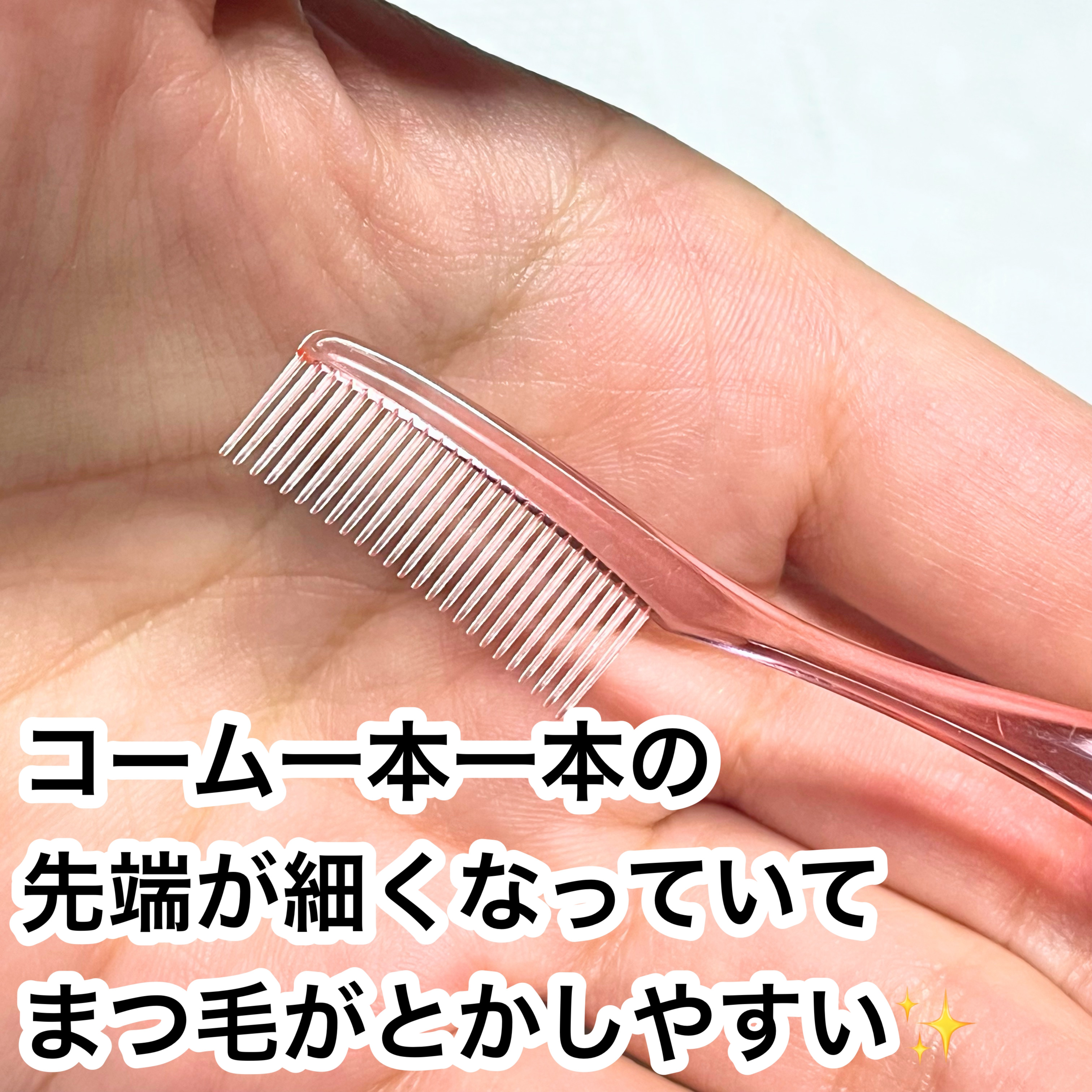まつ毛美容液を塗ると、 まつ毛が長くなるだけじゃなく、カールしやすくなったり抜けにくくもなります。 まつ毛コームを使うと、着きすぎちゃった余分なマスカラも取れるし、ダマにならないし、綺麗に束感を調節できます。 最後にホットビューラーで整えます。手間かかるけど、ホットビューラー使うようになってから本当にまつ毛褒められる事が増えました。