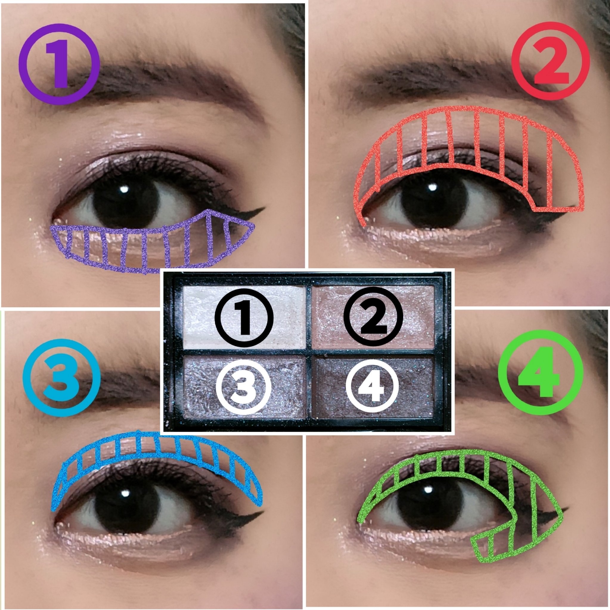アイシャドウパレットは、URGLAM UR GLAMBLOOMING EYE COLOR PALETTE 02を、使用しました。 マスカラは、MAYBELLINE NEW YORK コロッサルボリュームエクスプレスを、まつ毛全体にまんべんなく塗ります。 リップは、wet 'n' wild MegaLast Lip Colorを、唇全体にまんべんなく塗ります。