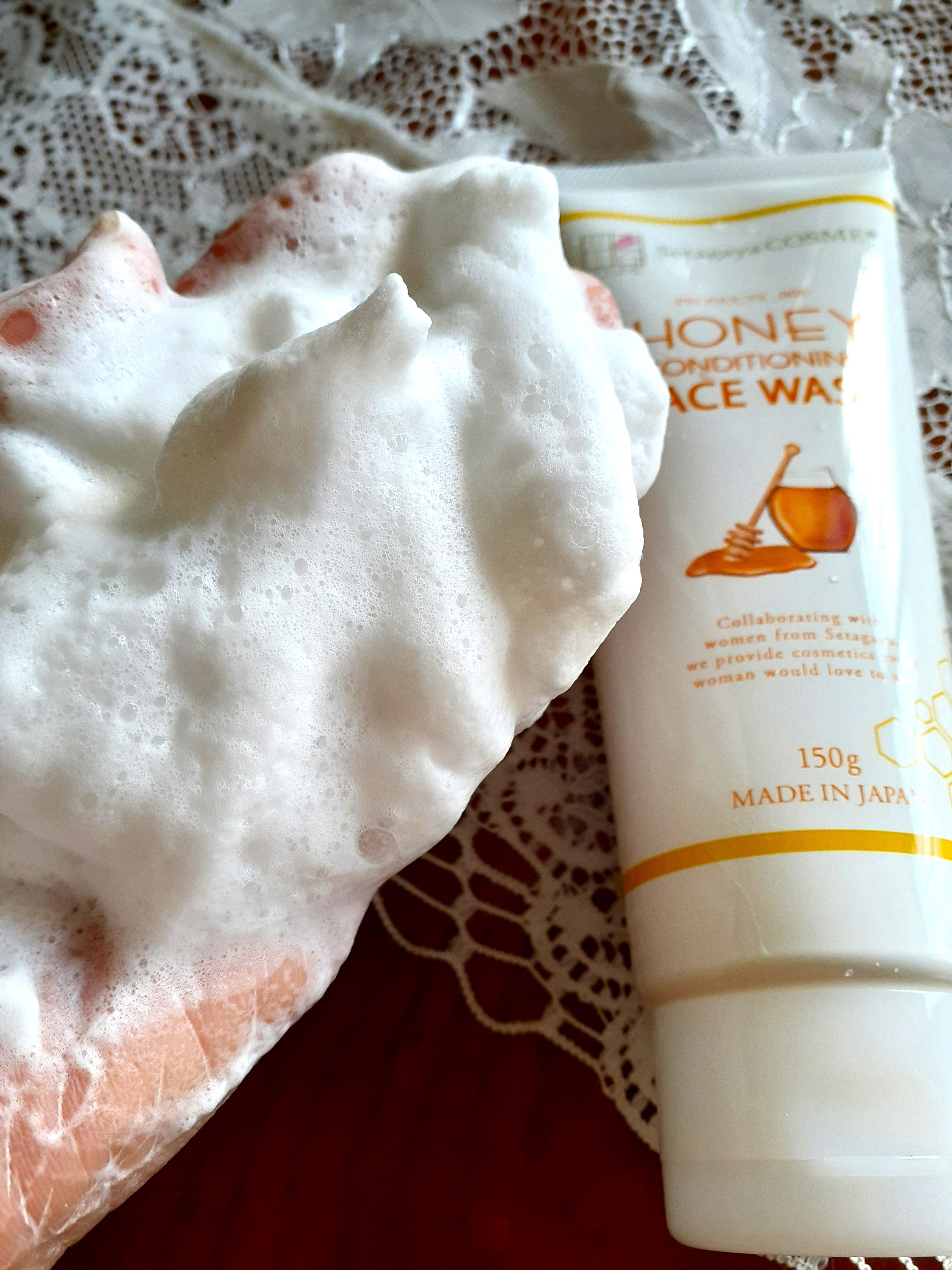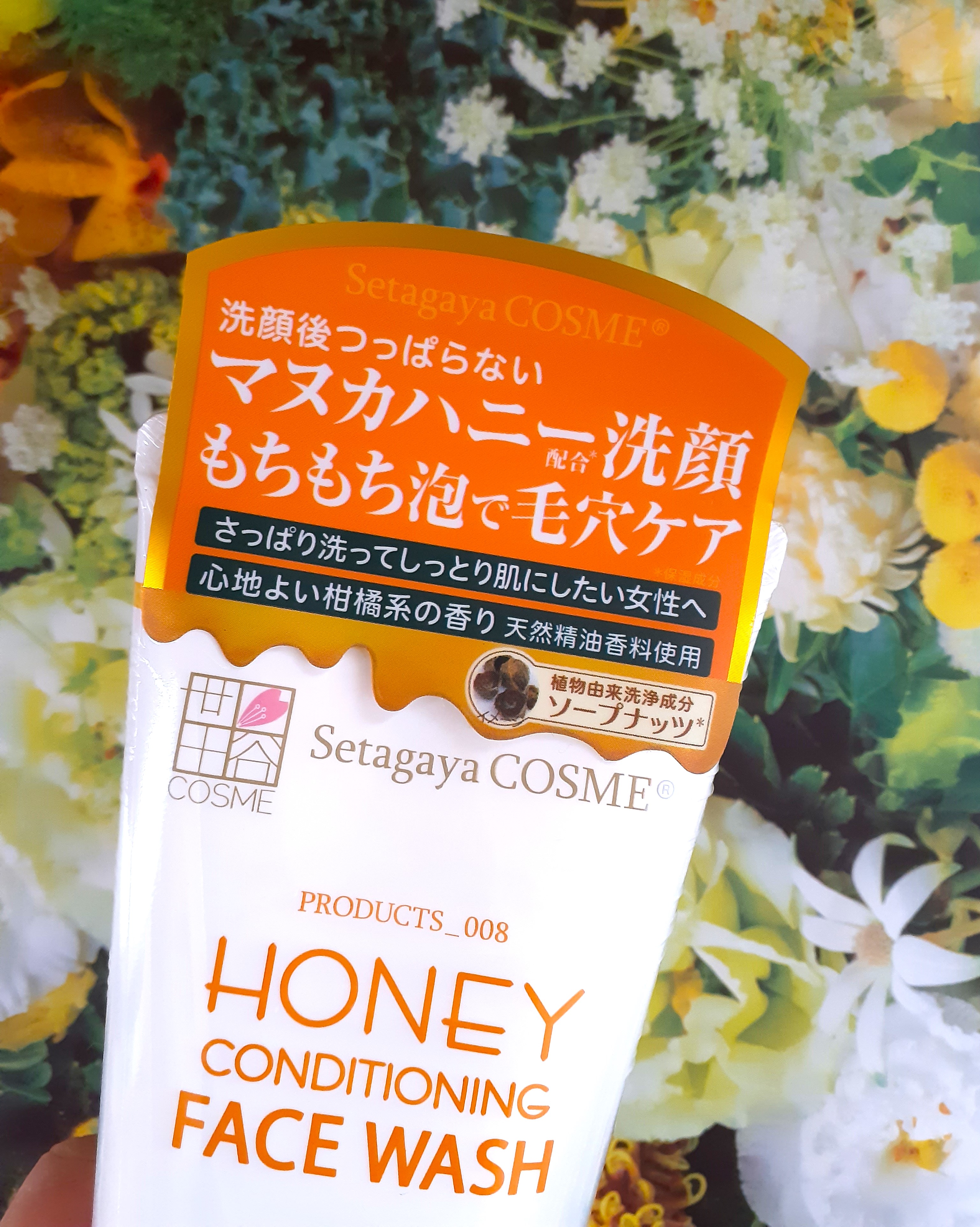 濃密な吸着泡が汚れにピタッと密着して、さっぱり洗ってまるでパックしているような密着感のとろ~りはちみつ吸着洗顔の世田谷コスメハニーフェイスウォッシュです。 爽やかな柑橘系の美味しそうな香りです。なめらかでやわらかなテクスチャーの洗顔料は、洗顔ネットで泡立てたら、あっという間にふわふわの泡になり、さっぱりなのにしっとりするような洗い心地です。 高い保湿力を持つマヌカハニーの他、4種の美容オイル、3種のセラミド、ヒアルロン酸Na、スイゼンジノリ多糖体などたっぷりの美容保湿成分配合してるんだそうです。