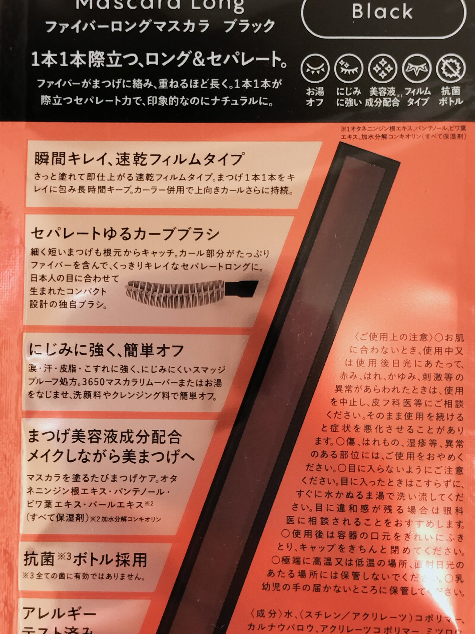 - 1本1本際立つ、ロング&セパレート。 ファイバーがまつげに絡み、重ねるほど長く。1本1本が際立つセパレート力で、印象的なのにナチュラルに。 【瞬間キレイ、速乾フィルムタイプ】 さっと塗れて即仕上がる速乾フィルムタイプ。まつげ1本1本をキレイに包み長時間キープ。上向きカール持続。 【セパレートゆるカーブブラシ】 細く短いまつげも根元からキャッチ。カール部分がたっぷりファイバーを含んで、くっきりキレイなセパレートロングに。 日本人の目に合わせて生まれたコンパクト設計の独自ブラシ。 【にじみに強く、簡単オフ】 涙・汗・皮脂・こすれに強く、にじみにくいスマッジプルーフ処方。3650マスカラリムーバまたはお湯をなじませ、洗顔料やクレンジング料でオフ。 【まつげ美容液成分配合メイクしながら美まつげへ】 マスカラを塗るたびまつげケア。オタネニンジン根エキス・パンテノール・ビワ葉エキス・パールエキス*1(全て保湿剤) 【抗菌*2ボトル採用】 【アレルギーテスト済み】 全ての人にアレルギーが起こらないわけではありません。 【アルコールフリー】 *1 加水分解コンキオリン *2 全ての菌に有効ではありません。