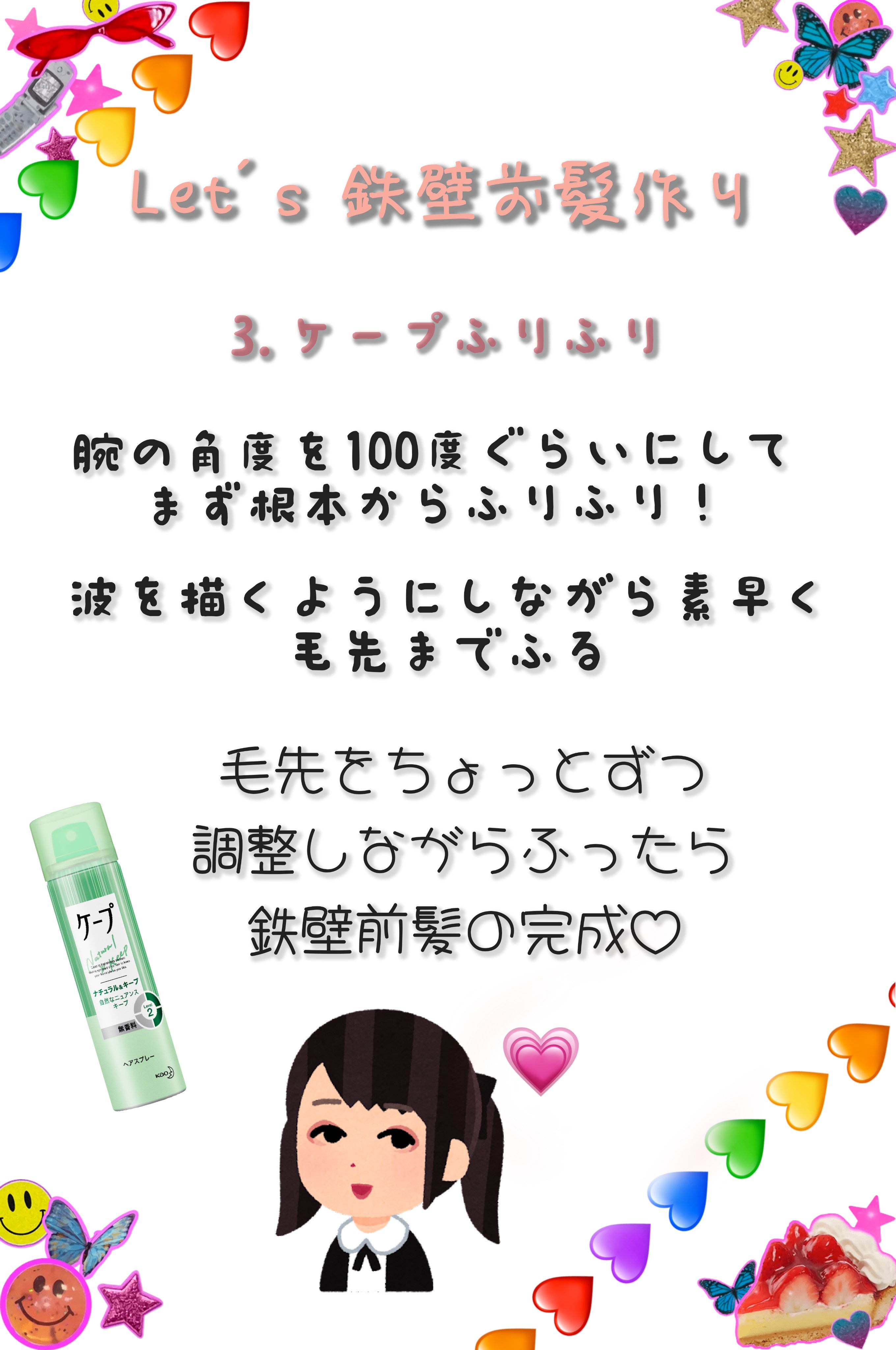 もともとはケープだけを振っていたのですが、 アホ毛止めを併用するようになってから一気に動かなくなっておまけにツヤ感も手に入れることができました♡ 最近はダイソーさんなど、100円ショップにも売っているので手に取りやすいと思います♡ おすすめはスリコのand usです✍️ この前髪を作り出してから運動してもぶんぶん振っても時を止めたみたいに動かなくなりました♡