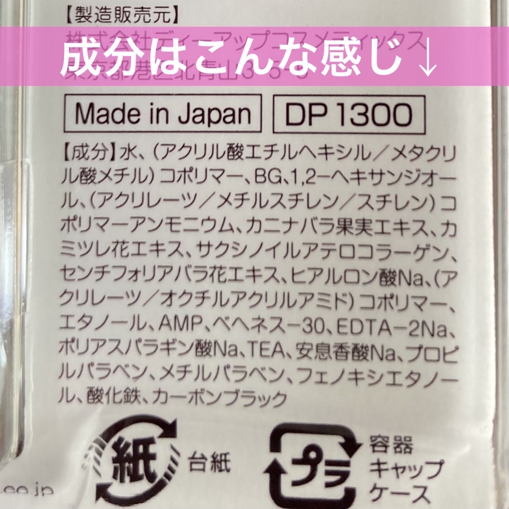 - <ミルクカプチーノ> 水、(スチレン/アクリレーツ)コポリマーアンモニウム、BG、炭、1,2-ヘキサンジオール、ベヘネス-25、カミツレ花エキス、ヒアルロン酸Na、サクシノイルアテロコラーゲン、カニナバラ果実エキス、センチフォリアバラ花エキス、エタノール、水酸化AI、ベヘネス-30、カプリリルグリコール、EDTA-2Na、リン酸2Na、エチルヘキシルグリセリン、グリセリン、ペンチレングリコール、リン酸K、ジラウロイルグルタミン酸リシンNa、ポリアスパラギン酸Na、メチルパラベン、フェノキシエタノール、酸化鉄、酸化チタン <ダークフィグ> 水、(スチレン/アクリレーツ)コポリマーアンモニウム、BG、炭、1,2ーヘキサンジオール、カニナバラ果実エキス、カミツレ花エキス、サクシノイルアテロコラーゲン、センチフォリアバラ花エキス、ヒアルロン酸Na、アクリレーツコポリマー、べへネスー30、カプリリルグリコール、EDTAー2Na、エチルヘキシルグリセリン、グリセリン、水酸化K、ペンチレングリコール、ポリアスパラギン酸Na、ジラウロイルグルタミン酸リシンNa、リン酸K、リン酸2Na、エタノール、フェノキシエタノール、メチルパラベン、酸化チタン、赤226、酸化鉄