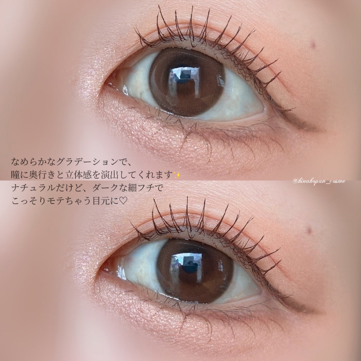 ソフトなブラウン×くっきりフチのチョコカラコン。グラデーションのデザインですが1色なので、焦げ茶色の瞳の私がつけるとグラデ感はほぼ分からない。 しっかり目元を盛りたい方に○ 着色直径は表記よりもやや大きめに感じました! 実際に鏡などで見てみるともう少し落ち着いた控えめブラウンです🫶