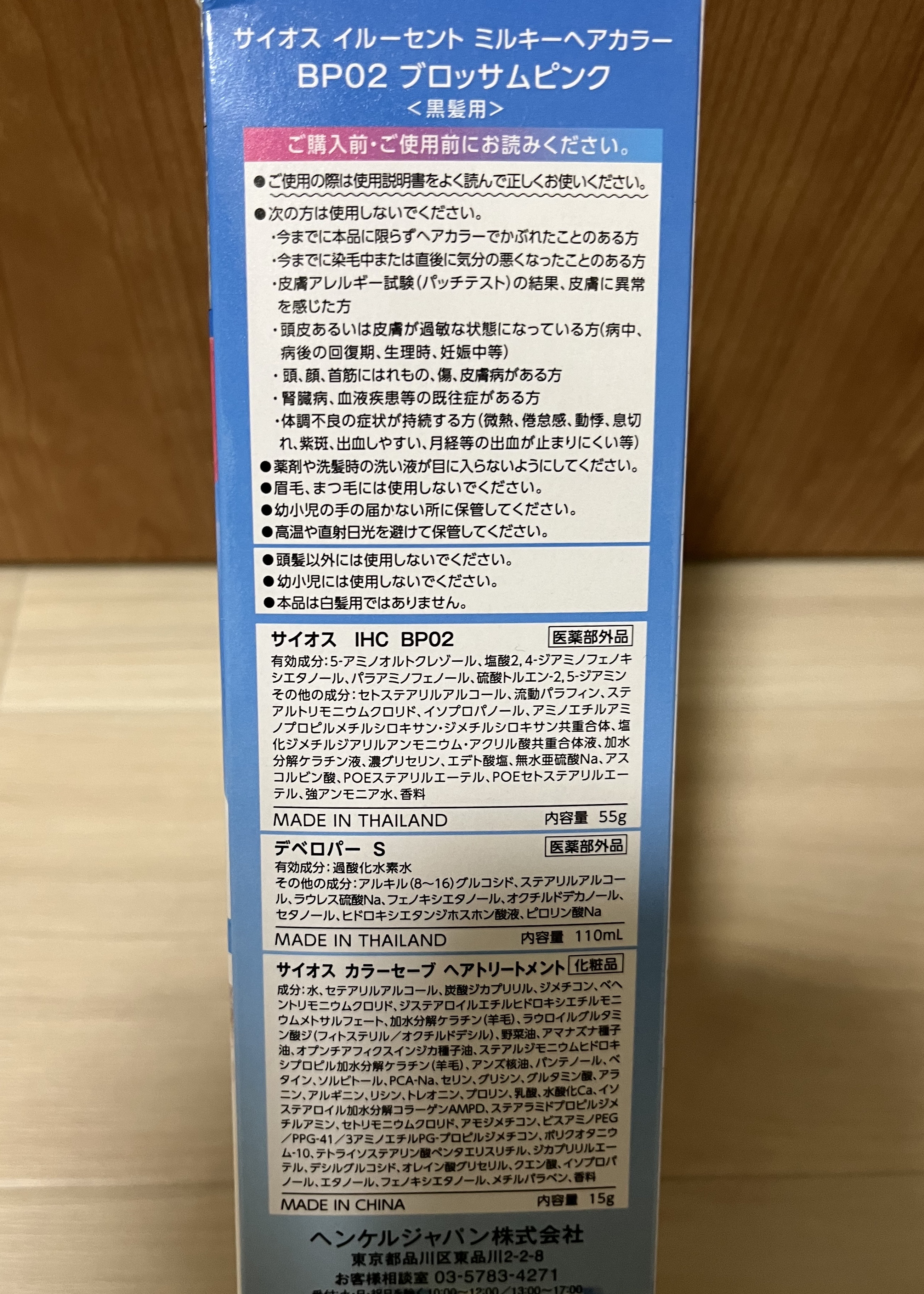 - <ブロッサムピンク> サイオス IHC BP02 有効成分:5‐アミノオルトクレゾール、塩酸2,4‐ジアミノフェノキシエタノール、パラアミノフェノール、硫酸トルエン‐2,5‐ジアミン その他の成分:セトステアリルアルコール、流動パラフィン、ステアルトリモニウムクロリド、イソプロパノール、アミノエチルアミノプロピルメチルシロキサン・ジメチルシロキサン共重合体、塩化ジメチルジアリルアンモニウム・アクリル酸共重合体液、加水分解ケラチン液、濃グリセリン、エデト酸塩、無水亜硫酸Na、アスコルビン酸、POEステアリルエーテル、POEセトステアリルエーテル、強アンモニア水、香料 デベロパー S 有効成分:過酸化水素水 その他の成分:アルキル(8~16)グルコシド、ステアリルアルコール、ラウレス硫酸Na、フェノキシエタノール、オクチルドデカノール、セタノール、ヒドロキシエタンジホスホン酸液、ピロリン酸Na サイオス カラーセーブ ヘアトリートメント 成分:水、セテアリルアルコール、炭酸ジカプリリル、ジメチコン、ベヘントリモニウムクロリド、ジステアロイルエチルヒドロキシエチルモニウムメトサルフェート、加水分解ケラチン(羊毛)、ラウロイルグルタミン酸ジ(フィトステリル/オクチルドデシル)、野菜油、アマナズナ種子油、オプンチアフィクスインジカ種子油、ステアルジモニウムヒドロキシプロピル加水分解ケラチン(羊毛)、アンズ核油、パンテノール、ベタイン、ソルビトール、PCA‐Na、セリン、グリシン、グルタミン酸、アラニン、アルギニン、リシン、トレオニン、プロリン、乳酸、水酸化Ca、イソステアロイル加水分解コラーゲンAMPD、ステアラミドプロピルジメチルアミン、セトリモニウムクロリド、アモジメチコン、ビスアミノPEG/PPG‐41/3アミノエチルPG‐プロピルジメチコン、ポリクオタニウム‐10、テトライソステアリン酸ペンタエリスリチル、ジカプリリルエーテル、デシルグルコシド、オレイン酸グリセリル、クエン酸、イソプロパノール、エタノール、フェノキシエタノール、メチルパラベン、香料 <チェリーピンク> サイオス IHC CP03 有効成分:5‐アミノオルトクレゾール、塩酸2,4‐ジアミノフェノキシエタノール、パラアミノフェノール、硫酸トルエン‐2,5‐ジアミン その他の成分:セトステアリルアルコール、流動パラフィン、ステアルトリモニウムクロリド、イソプロパノール、アミノエチルアミノプロピルメチルシロキサン・ジメチルシロキサン共重合体、塩化ジメチルジアリルアンモニウム・アクリル酸共重合体液、加水分解ケラチン液、濃グリセリン、エデト酸塩、無水亜硫酸Na、アスコルビン酸、POEステアリルエーテル、POEセトステアリルエーテル、強アンモニア水、香料 デベロパー S 有効成分:過酸化水素水 その他の成分:アルキル(8~16)グルコシド、ステアリルアルコール、ラウレス硫酸Na、フェノキシエタノール、オクチルドデカノール、セタノール、ヒドロキシエタンジホスホン酸液、ピロリン酸Na サイオス カラーセーブ ヘアトリートメント 成分:水、セテアリルアルコール、炭酸ジカプリリル、ジメチコン、ベヘントリモニウムクロリド、ジステアロイルエチルヒドロキシエチルモニウムメトサルフェート、加水分解ケラチン(羊毛)、ラウロイルグルタミン酸ジ(フィトステリル/オクチルドデシル)、野菜油、アマナズナ種子油、オプンチアフィクスインジカ種子油、ステアルジモニウムヒドロキシプロピル加水分解ケラチン(羊毛)、アンズ核油、パンテノール、ベタイン、ソルビトール、PCA‐Na、セリン、グリシン、グルタミン酸、アラニン、アルギニン、リシン、トレオニン、プロリン、乳酸、水酸化Ca、イソステアロイル加水分解コラーゲンAMPD、ステアラミドプロピルジメチルアミン、セトリモニウムクロリド、アモジメチコン、ビスアミノPEG/PPG‐41/3アミノエチルPG‐プロピルジメチコン、ポリクオタニウム‐10、テトライソステアリン酸ペンタエリスリチル、ジカプリリルエーテル、デシルグルコシド、オレイン酸グリセリル、クエン酸、イソプロパノール、エタノール、フェノキシエタノール、メチルパラベン、香料 <ヌードグレージュ> サイオス IHC NG02 有効成分:塩酸2,4‐ジアミノフェノキシエタノール、パラアミノフェノール、メタアミノフェノール、硫酸トルエン‐2,5‐ジアミン、レゾルシン その他の成分:セトステアリルアルコール、流動パラフィン、ステアルトリモニウムクロリド、イソプロパノール、アミノエチルアミノプロピルメチルシロキサン・ジメチルシロキサン共重合体、塩化ジメチルジアリルアンモニウム・アクリル酸共重合体液、加水分解ケラチン液、濃グリセリン、エデト酸塩、無水亜硫酸Na、アスコルビン酸、POEステアリルエーテル、POEセトステアリルエーテル、強アンモニア水、香料 デベロパー S 有効成分:過酸化水素水 その他の成分:アルキル(8~16)グルコシド、ステアリルアルコール、ラウレス硫酸Na、フェノキシエタノール、オクチルド