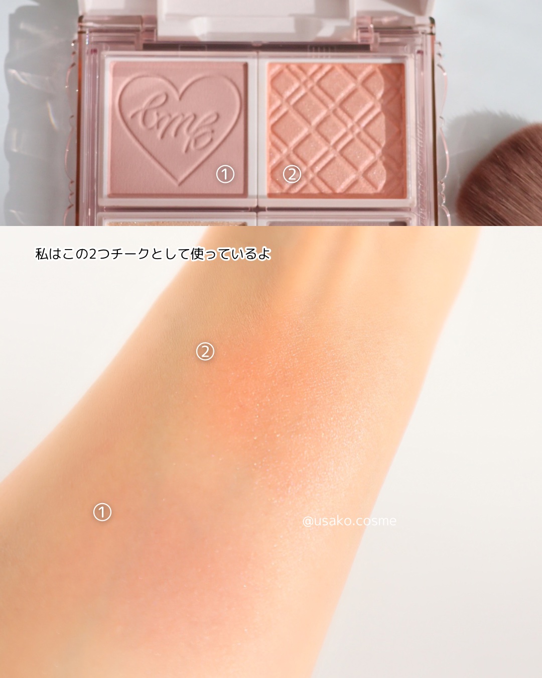 明るい柔らかなパステルトーンのカラーで、ふんわり発色して、かわいい😊💕 ピンクとオレンジの中間みたいな、まさにピーチカラー💓 全体的にコーラル系のオレンジっぽいカラーなんだけど、マットや細かいラメが入っていたり、つけるとそれぞれちゃんと違う色。 グリッターは固めで大粒なので、指でトントン付けがおすすめ。涙袋につけてもかわいい😍 クリアな印象の明るい目元になるよ🥰 パステル系のアイシャドウパレットが好きって人はピッタリだと思う🙆 適度な彩度で透明かついきいきとした印象のコーラルピーチトーンの桃色カラーバリエーション 搾りたての桃果汁カラーに、輝く日差しのかけらグリッターを加えたデイリーコーラルピーチパレット