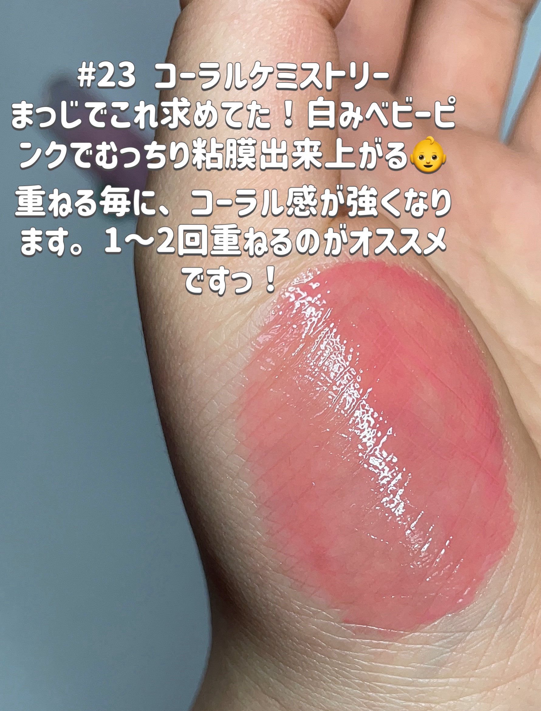 ミュートトーンの青みピンク!蛍光ピンクじゃなくて、どぎつく見えないからブルベは絶対買って欲しい色🩵大人っぽい雰囲気になれます🍀 白身が入ったミルキーコーラルカラー🍼もうこれが可愛すぎて新色発売されたら絶対買おうと思ってました! 1度塗りならリップベースにも使えるし重ねることで濃くなっていくから、もちろんこれ1本でも余裕で仕上げられます✌️ つやっともっちりした質感が好きな人は絶対買いだと思います!!