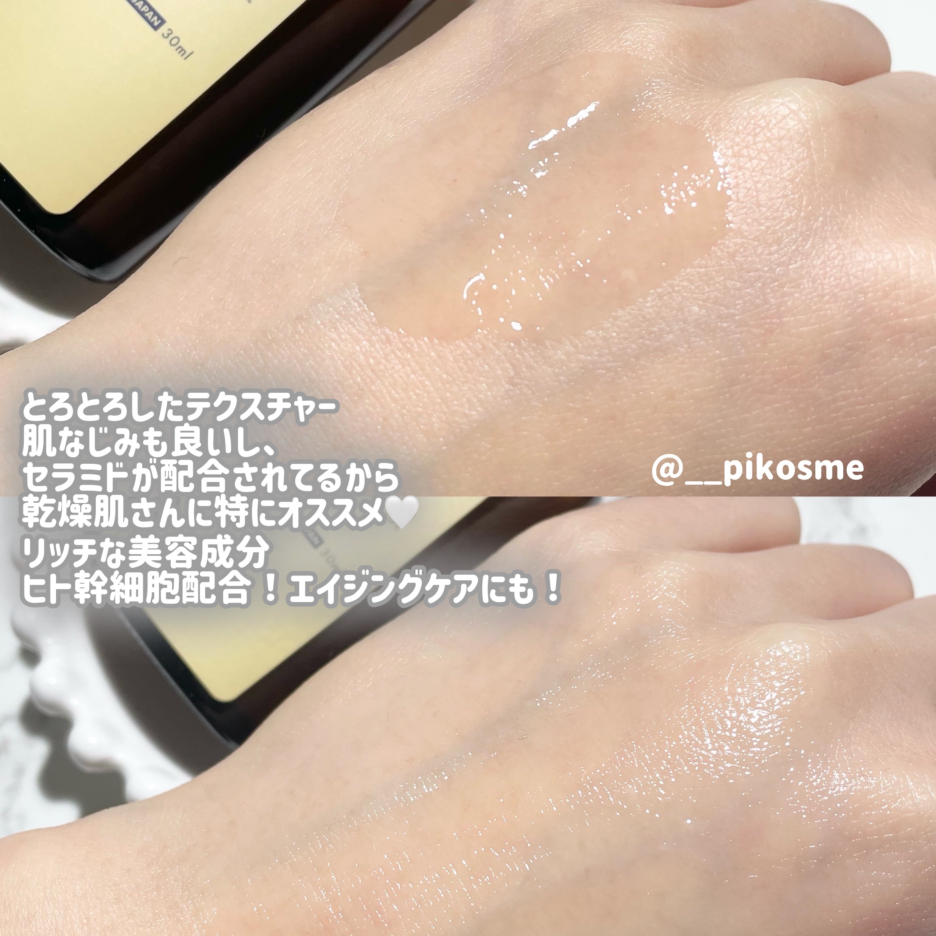 加齢によるたるみや小じわ ほうれい線、しみくすみにアプローチしてくれるヒト幹細胞培養を高配合した美容液👀♡ ハリ・つや・潤いが期待できるよ! スポイトタイプで使いやすい! うっすらピンクのとろみのあるテクスチャーで伸びも馴染みも◎ 嫌なべたつきもないので、とっても使いやすいです🥰