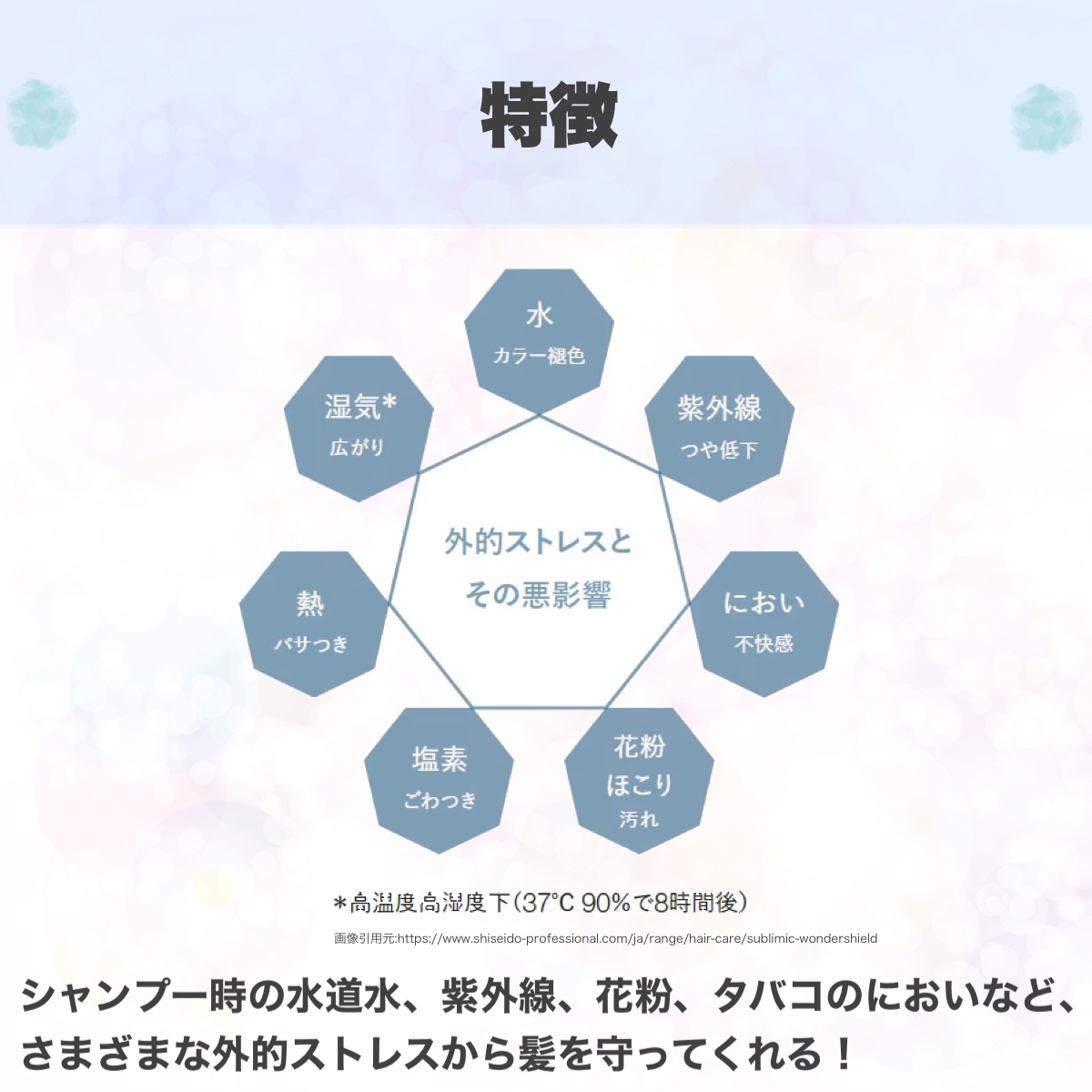 - <洗い流さないトリートメント> 3日に1 回、自宅でご使用いただくスペシャルケア。 見えないシールドで髪を包み込み、サロンで仕上げた、なめらかな髪を長く持続させます。