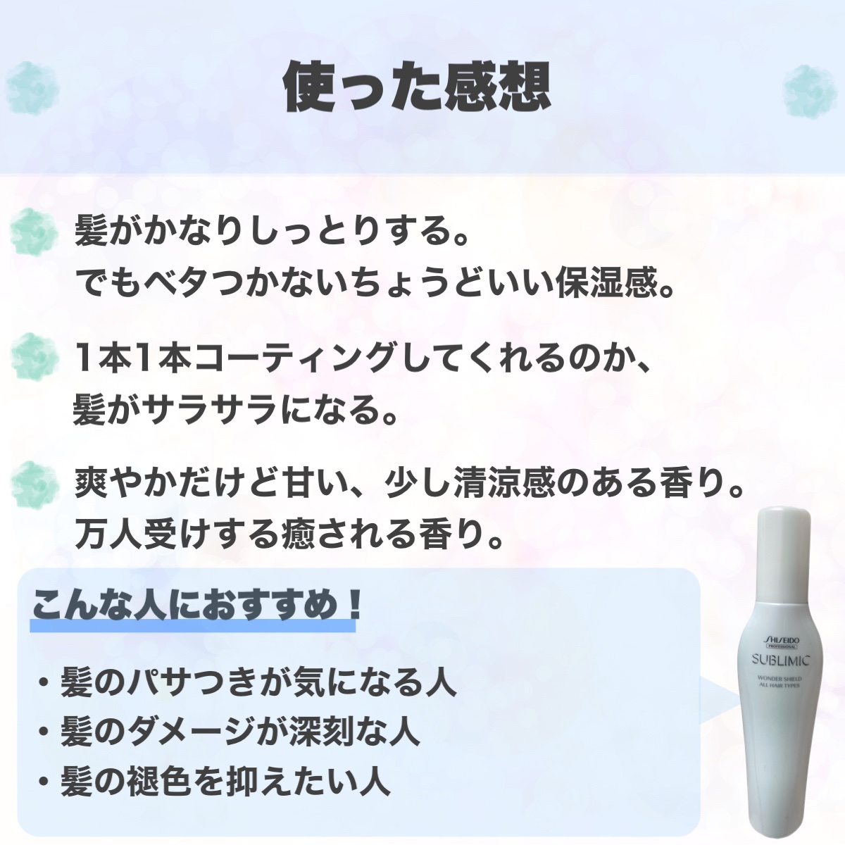 サブリミックさまからいただきました!\3日に1度のスペシャルケア/髪にダメージをもたらす外的要因から守ってくれるヘアミスト「サブリミックワンダーシールド」🪄髪1本1本にシールド膜を巡らせ、紫外線や花粉・洗髪ダメージなどさまざまなダメージ要因か...