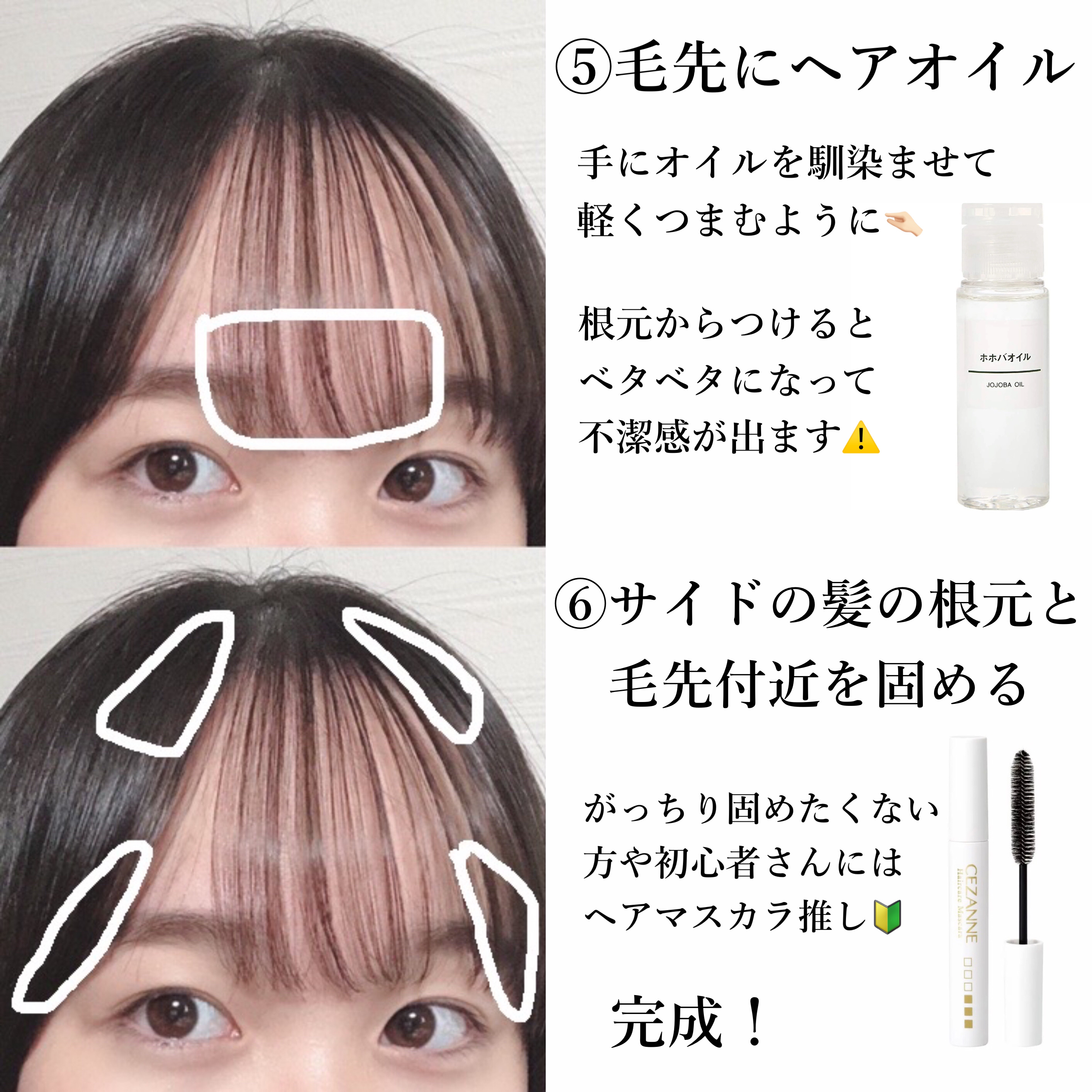 ①おでこにパウダーさらさらになって崩れにくくなります! ②全体をストレートに ③前髪を3等分してふんわり巻くくるっと巻くよりはそのままアイロンを前に持っていく感じでまきます! ④触覚を外側に向けて毛先をワンカール学校では短めの触覚だけ出すことが多いです!毛先をくるっと巻いて形を整える♡ 固めたい方はケープの「緑」の方がナチュラルに固まってふんわりするのでおすすめです💚 前髪の方向を変えずにワンカールしてるので崩れにくくて学生さんにもすっごくおすすめです💓