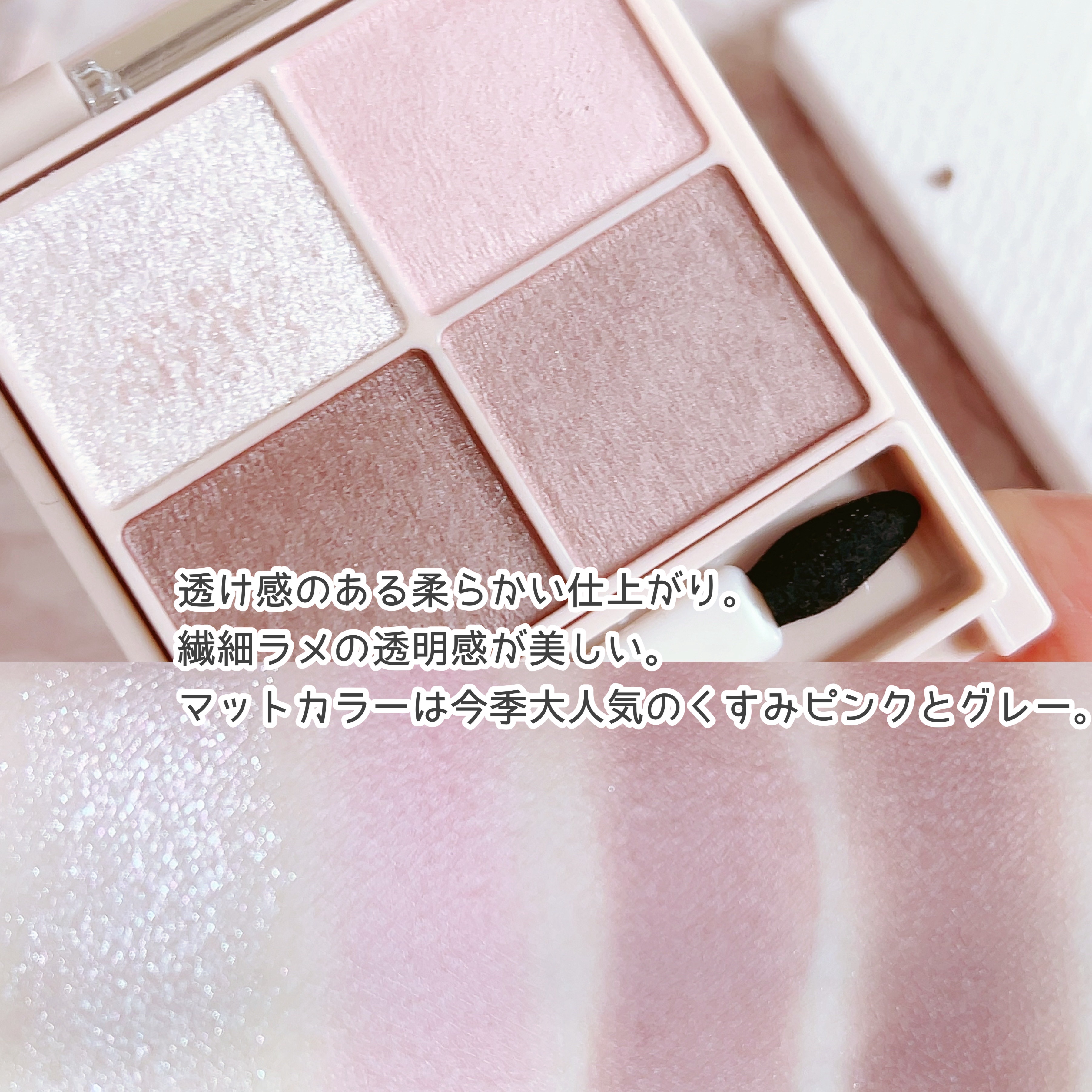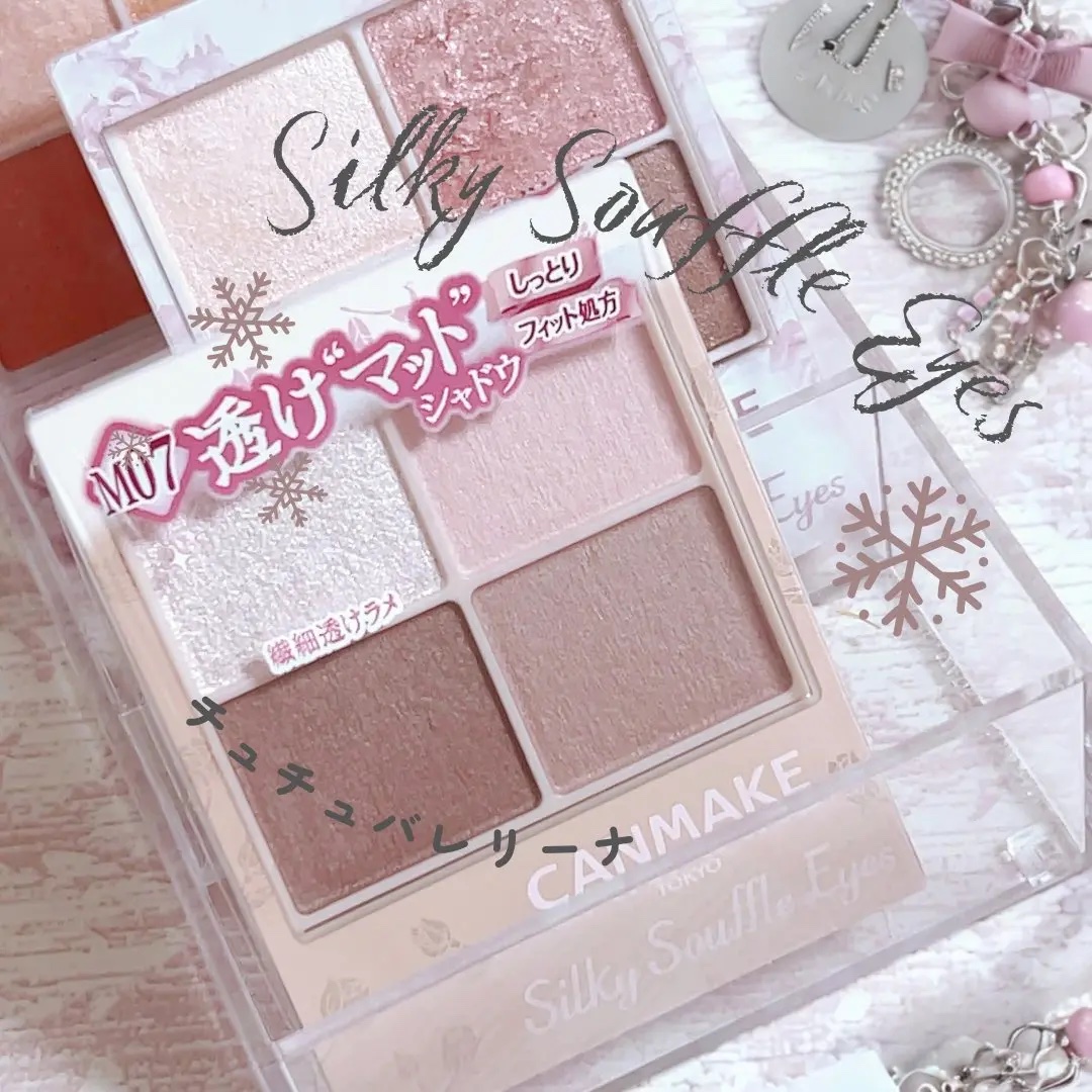 - シルキースフレアイズの姉妹品♡ 肌に溶け込むような透けマットシャドウ 透け感のある柔らかい仕上がりになるマット3色と、透け発色の繊細ラメ1色のパレットシャドウ♡ 完全マットアイや、ラメ×マットアイなど、メイクのパターンを楽しみましょう!