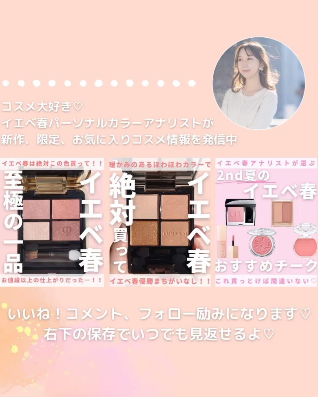ルナソルのピンクはラメ感控えめなのでオフィスメイクにおすすめ🙆🏻♀️✨ CHANELはかなり万能だと思っていて、柔らかく仕上げればイエベ春の私ももちろんハマるし✨ ブランドごとにもちろん特徴がありますし、ピンクといってもパレットによって仕上がりはさまざま!