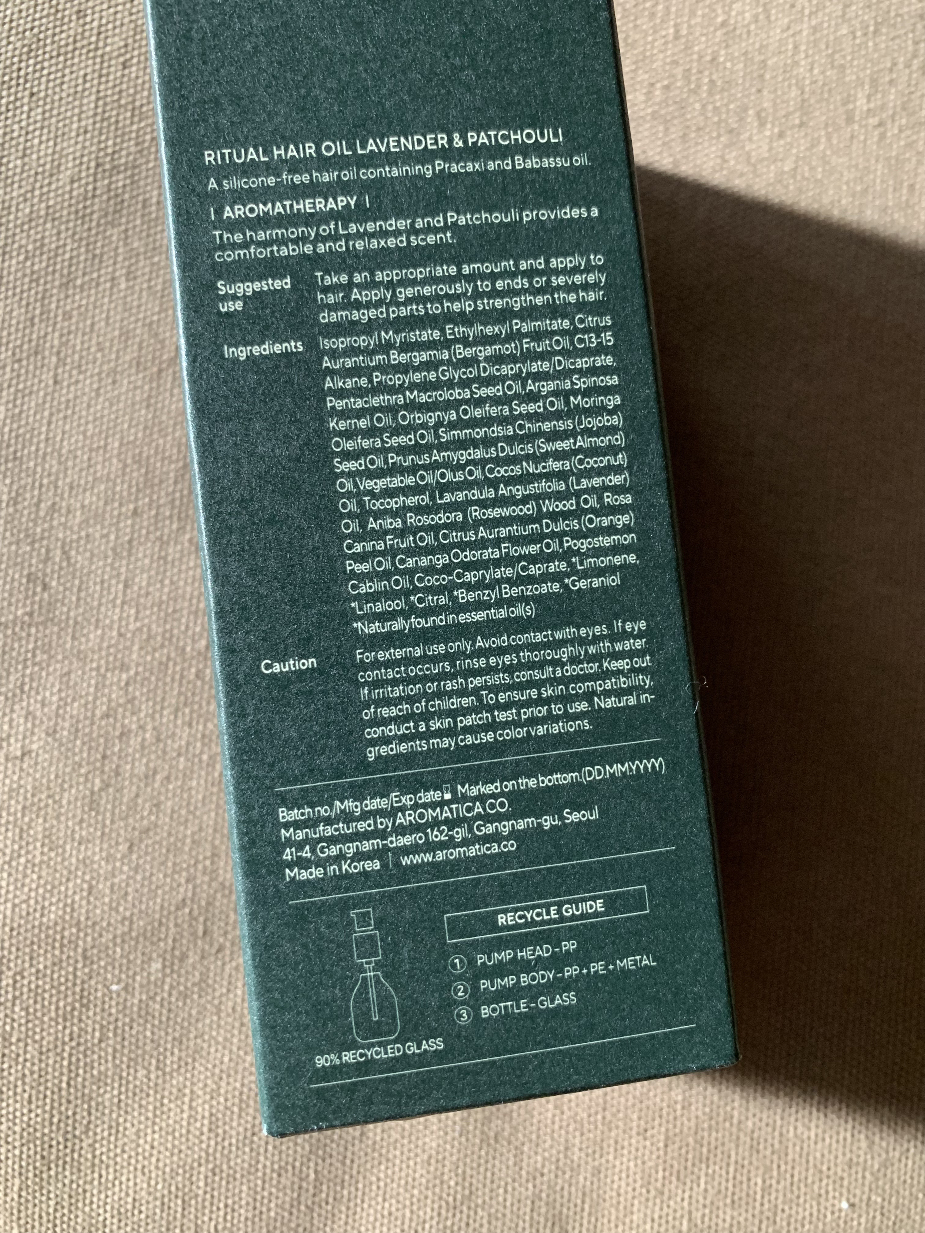シリコンフリーのヘアオイル ✔ベタつかずにツヤ感を与える サラッとしたテクスチャーのオイル。手のひらに出して傾けると水のように垂れていくほどサラサラです! こちらのラベンダー&パチョリの香りは私的イメージでは 'お洒落な人' の香りですごく好みでした💓💓