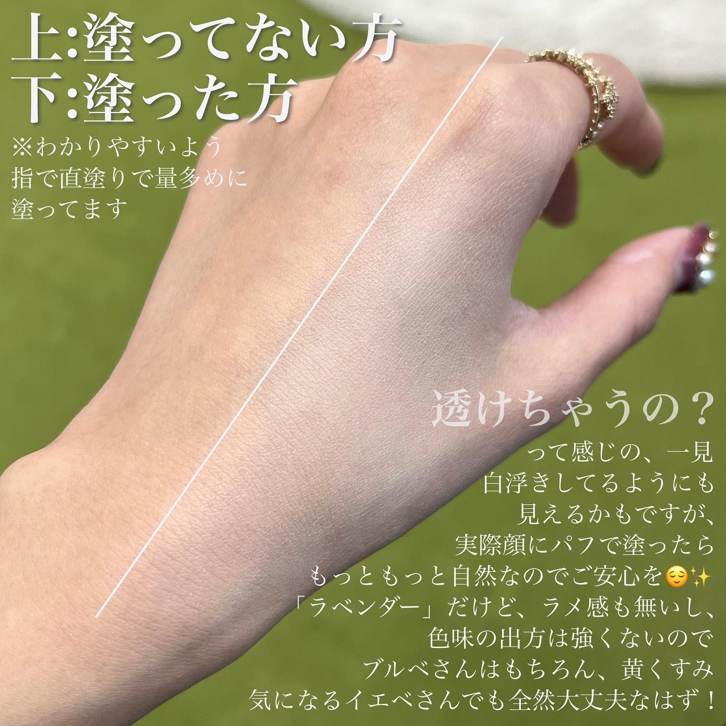 肌にのせたことを感じさせないほど、付け感ゼロで軽やかな超微粒子の無重力パウダー。 余分な皮脂を吸着しテカリも抑えてくれます。 毛穴をふんわりボカしてくれてフィルターをかけたようなセミマットな仕上がり♡ ラベンダーカラーなので透明感もアップします◡̈ 気になった方チェックしてみて下さいね(✿︎´ ꒳ ` )♡︎