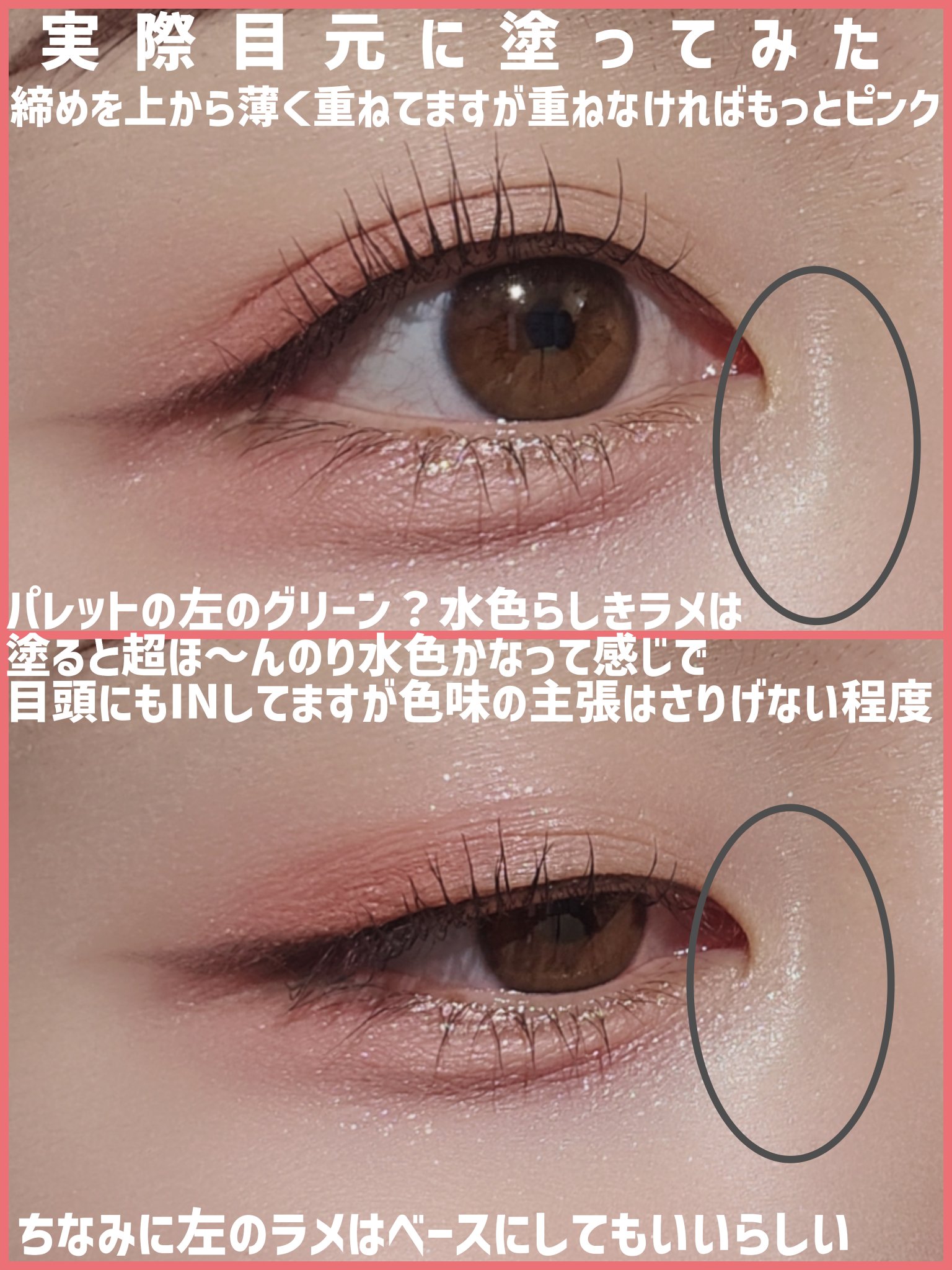 全体のローズ感と粉質もたまらなくいいんですが 左下のハイライトカラー?パールの粉が すんごい涙袋にいいんですよ… パーンとめちゃくちゃ涙袋盛れるけど、 ほんのりピンクがかった白みベージュなので 平成ギャルみたいになるわけではない…と思う ほんとこのハイライトカラーが涙袋に良すぎて いつかここだけ底見えする説…