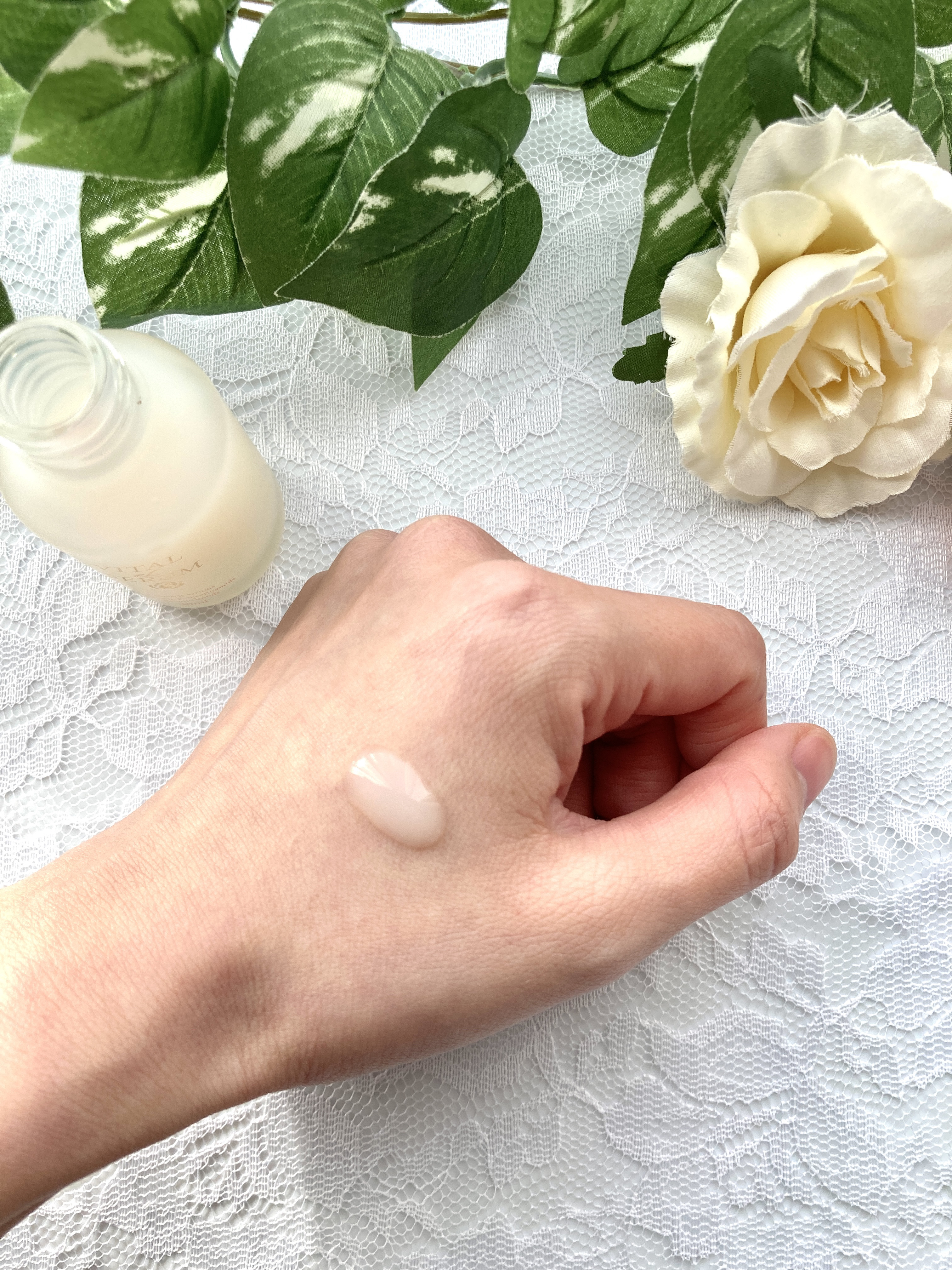 さらさらで伸びが良いテクスチャー。 肌への密着感もあって、ピンクベージュの色みが毛穴のカバーとほんんのりトーンアップも。 クリームのようなテクスチャー。 肌にのせすぎると白っぽくなるので、少しずつ伸ばすのが◎ なめらかテクスチャー。 細かいパールが入ってますが、ギラギラしたりもなく自然な感じ。