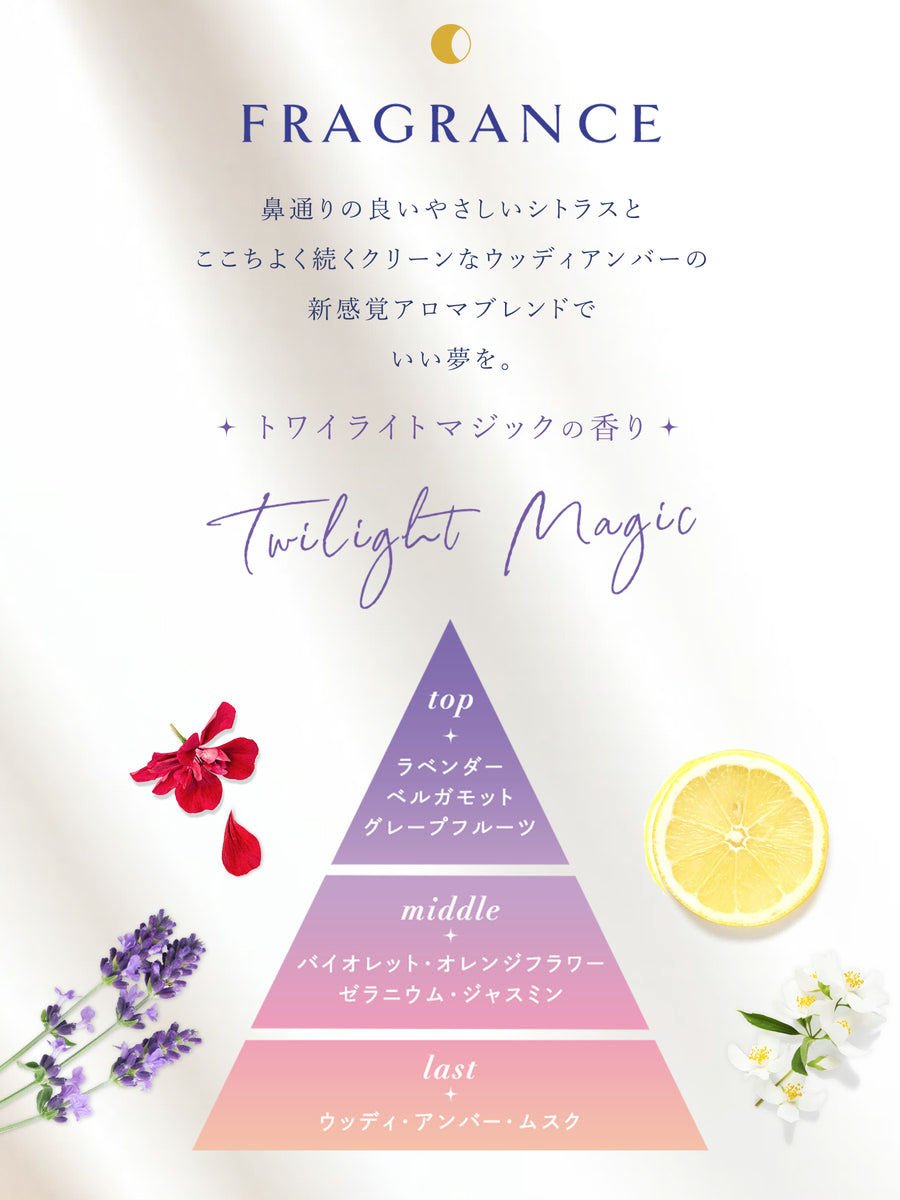 - 深呼吸フレグランスでベッドルームもお洋服も心地よく。 空間の香りを楽しみたい時や、布製品のニオイが気になる時にお使いください。 クリアなアンバーとやさしいシトラスの新感覚アロマ、トワイライトマジックの香り。 ●W除菌*・消臭 ●オーガニック植物エキス配合 ●寝具・カーペットや布製のコート・靴、リラックス空間、ペット周りのニオイなどに ※すべての菌に効果があるわけではありません