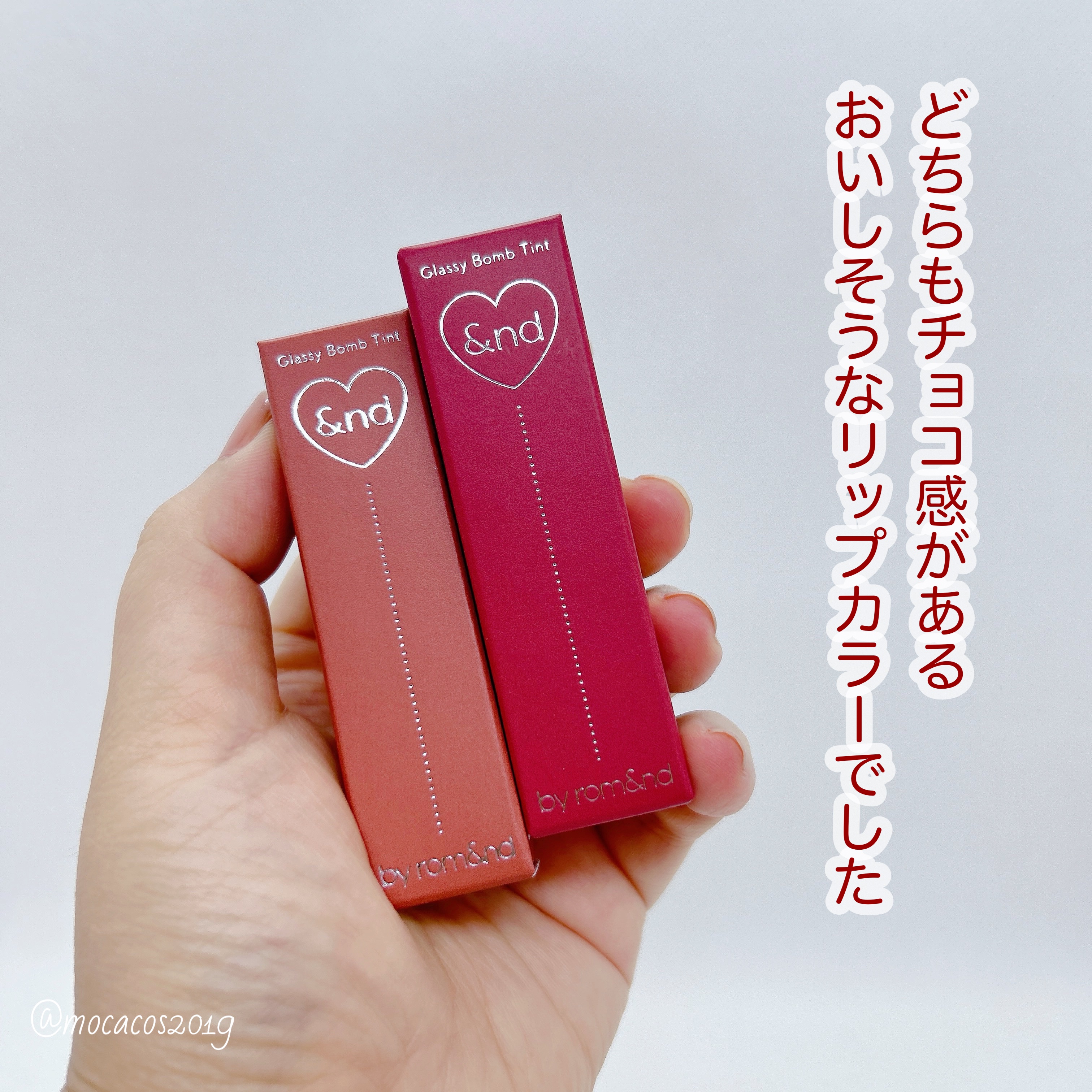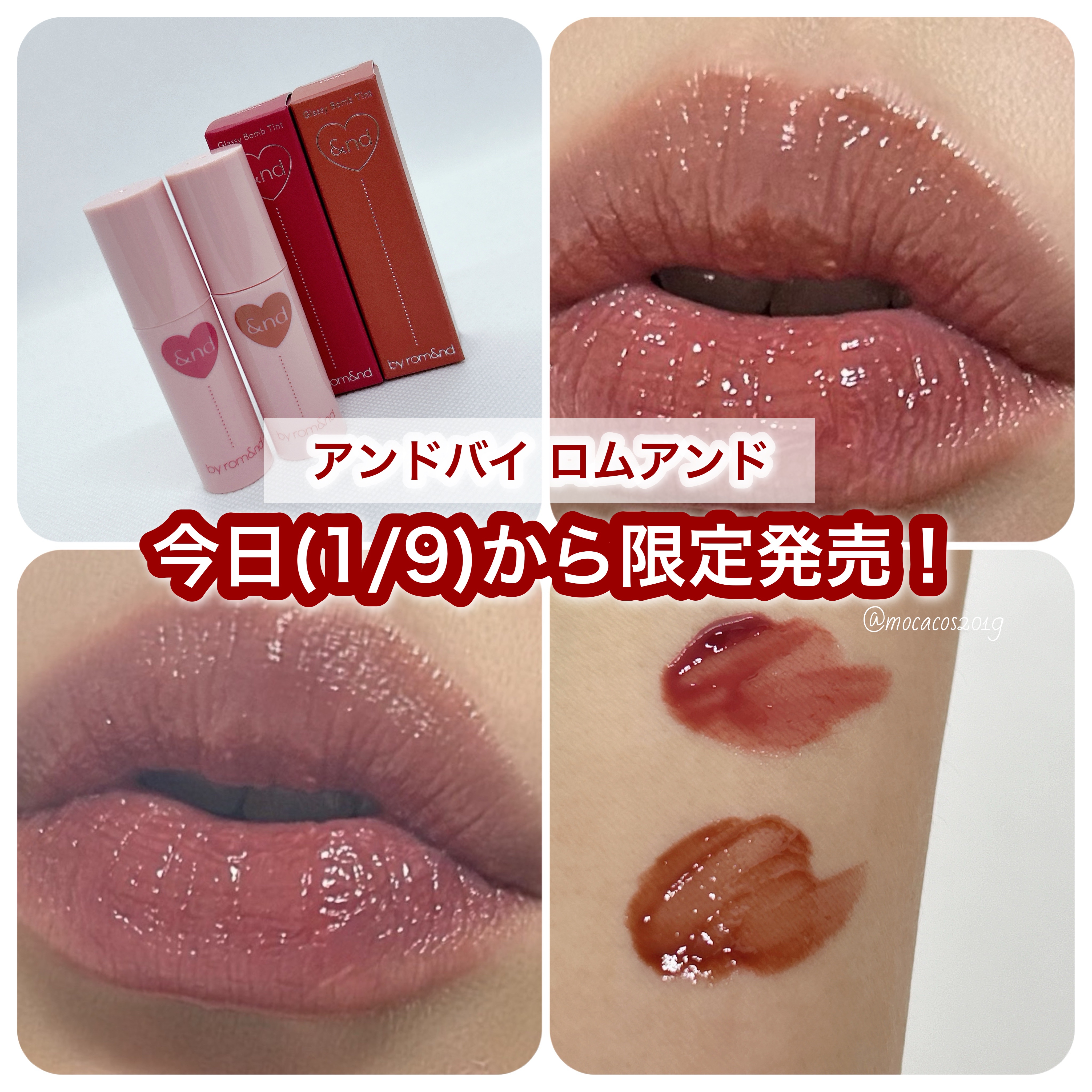 ローソン限定!ロムアンドコラボティント♡&ndbyrom&nd「アンドバイロムアンド グラッシーボムティント」 ¥820・BE01ヌーディーヌード・BR01デザートブリック・BR02ローズビーン・BR03ココアブラウン・VD01Milkyco...