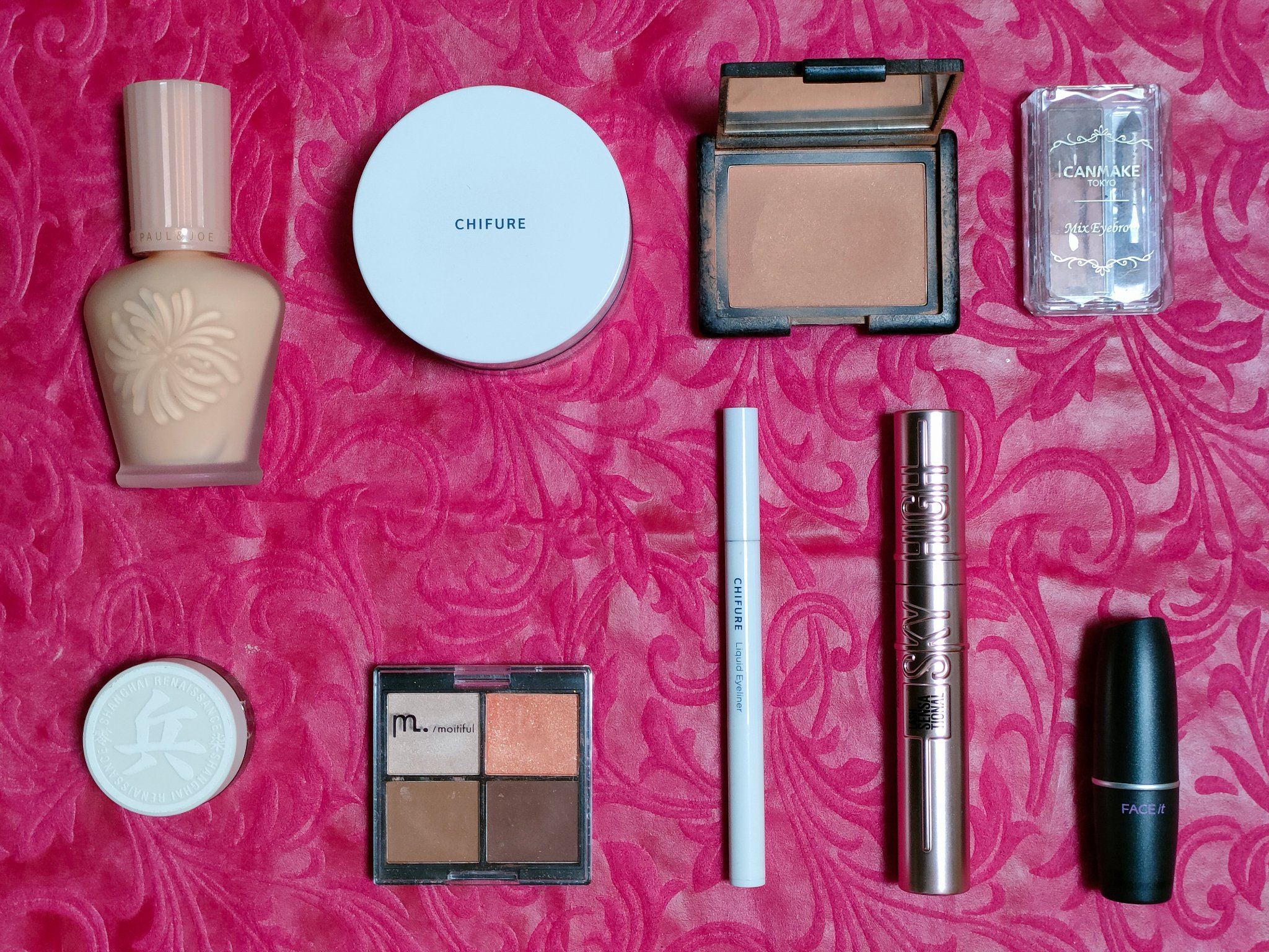 アリィー ニュアンスチェンジUV ジェル RSを、顔全体にまんべんなく塗ります。 RMK RMK ジェルクリーミィファンデーション 103を、顔全体にまんべんなく塗ります。 ジョンソンベビー ジョンソン ベビーパウダーを、顔全体にまんべんなく軽くはたきます。 THE BODY SHOP bronze shade warm glowを、両頬に塗ります。 KATE リフレクトミラーアイズ BR-1の締め色を、眉毛全体にまんべんなく塗ります。 URGLAM UR GLAMBLOOMING EYE COLOR PALETTE 01を、使用しました。 ちふれ リキッド アイライナー 筆ペンタイプ BK30 ブラックを、塗ります。 CEZANNE エアリーカールマスカラを、まつ毛全体にまんべんなく塗ります。 MAYBELLINE NEW YORK コロッサルボリュームエクスプレスを、まつ毛全体にまんべんなく塗ります。 MAYBELLINE NEW YORK SPステイ マットインク 135を、唇全体にまんべんなく塗ります。