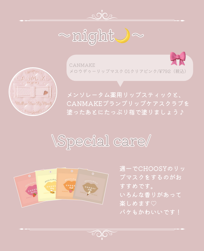 ぷるっぷるのリップでテンションアップ⤴︎⤴︎ 日頃私がやってるリップケアをご紹介します!! 〜夜のケア🌃〜 ・寝る前にプランプリップケアスクラブを満遍なくなく塗り、荒れている部分があれば指の腹でクルクル優しく皮を取り除く シンプルですが毎日やることで唇が荒れにくくなります👏 乾燥が気になる時期なので忘れずにケアしてもっと可愛くなりましょう!!🥰
