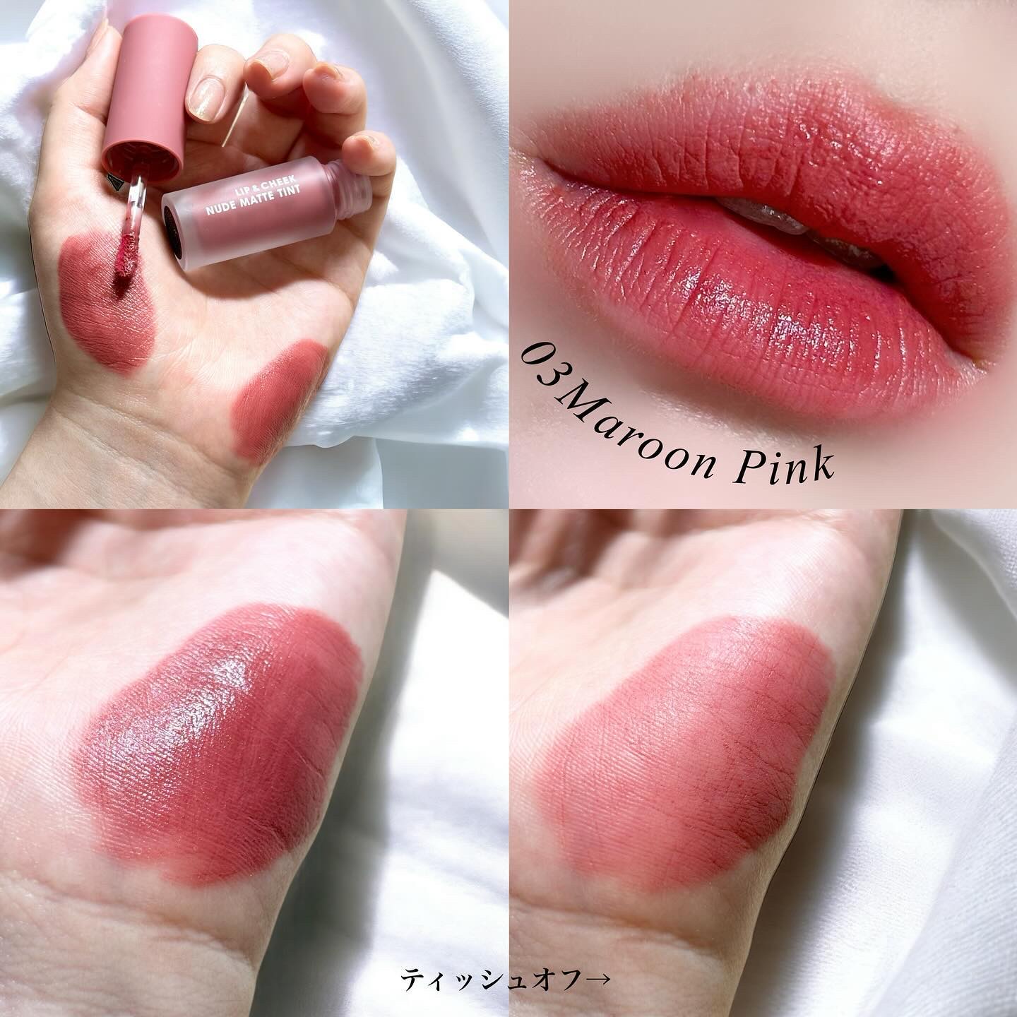 - 「リップアンドチーク ヌードマットティント」は、リップにもチークにも使える、2way仕様のマットな質感のティントカラー。 やわらかく軽いつけ心地で、唇にうるおいを与え、フレッシュな色味が長時間続きます。 多彩なカラーバリエーションで、顔色を引き立てます。 ツバキ花エキス配合。ベリーの香りつき。