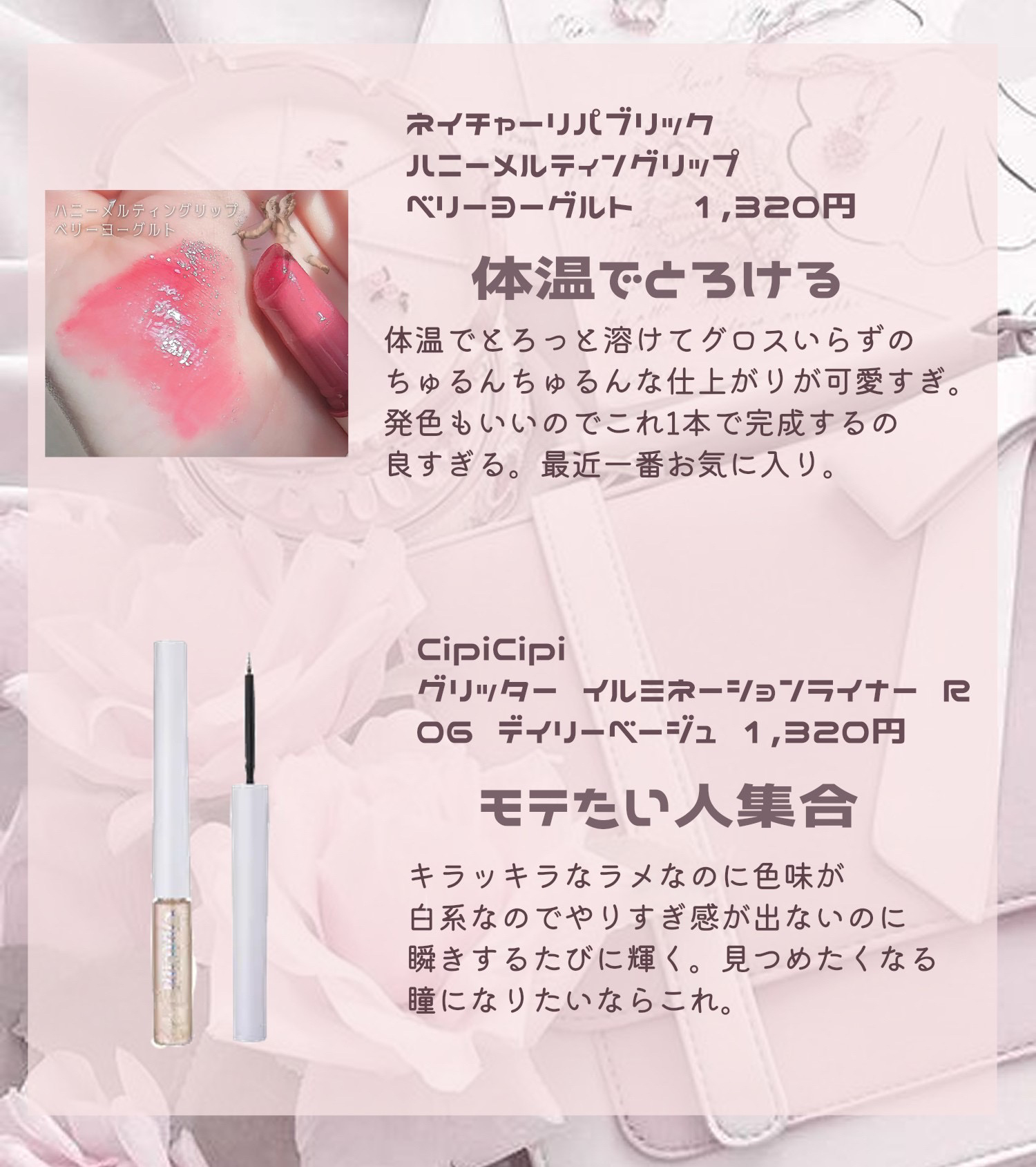 。*❤︎…購入品紹介…❤︎*。こんにちは!今回はCipiCipiの新作をレビューさせて頂きます💁♀️・①CipiCipiシピシピ ポアレスチーク101¥1,430こちらはチークになります!ゴールドラメが入っていて、夏っぽい色味とツヤ感がとて...