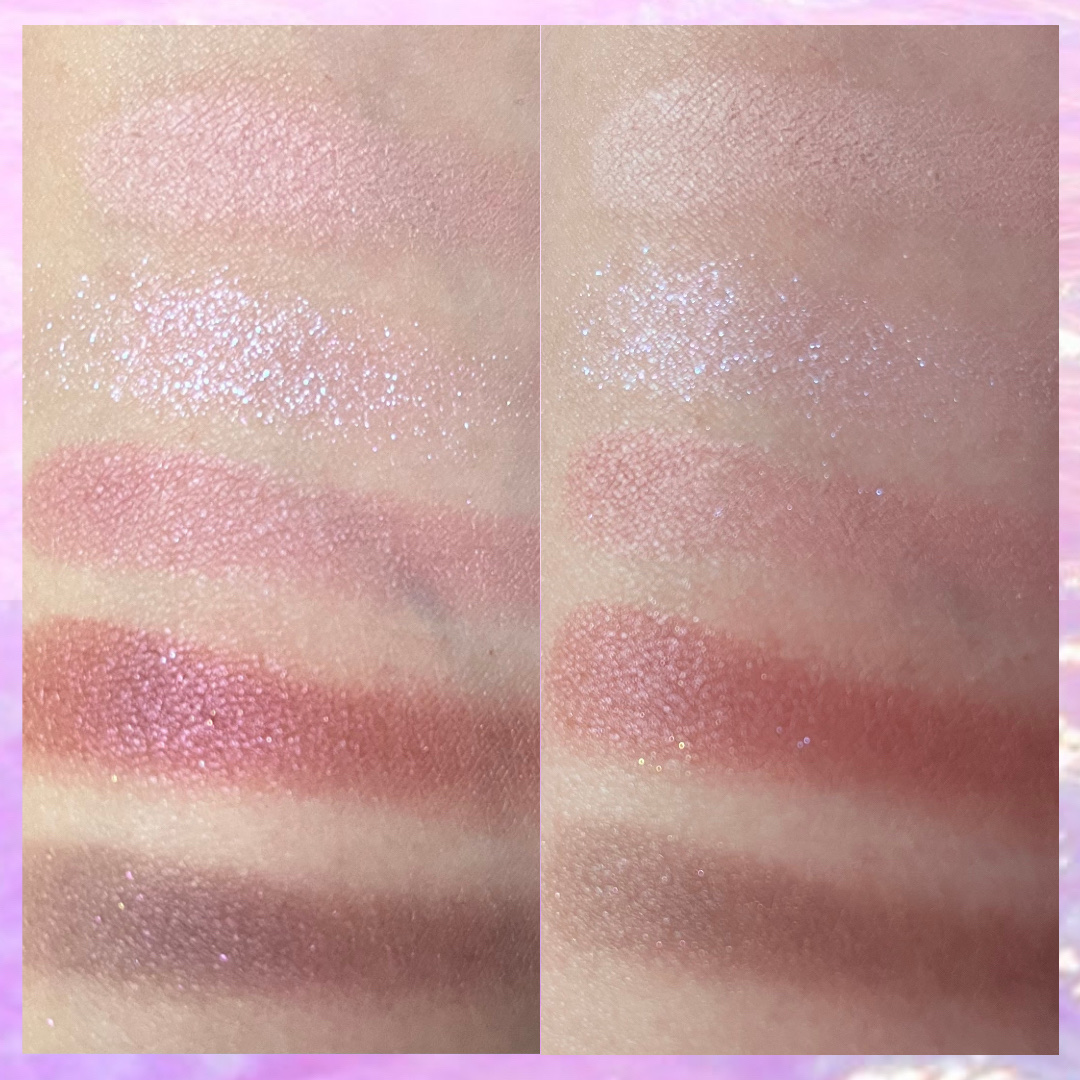 ⭐︎パーフェクトダイアリーシルバーパールキラキラ!!ひと塗りでしっかり付く✨ ⭐︎Diorプルーパールでキラキラ✨こちらも粉質良くてひと塗りでしっかり付く!写真で見ると1番キラキラに見えました。大きいパールと小さいパールのどちらもある感じでさすがDior👏 ⭐︎fwee粉が硬めで付きが他に比べて弱く感じました💦パールがシルバー系で見た目はパーフェクトダイアリーに似ていたので個人的にはこれよりもパーフェクトダイアリーの方がおすすめ! MACこれは細かいパールぎっしりの面で光る感じ✨パープルっぽく光るのでピンク系のメイクと合いそう♡