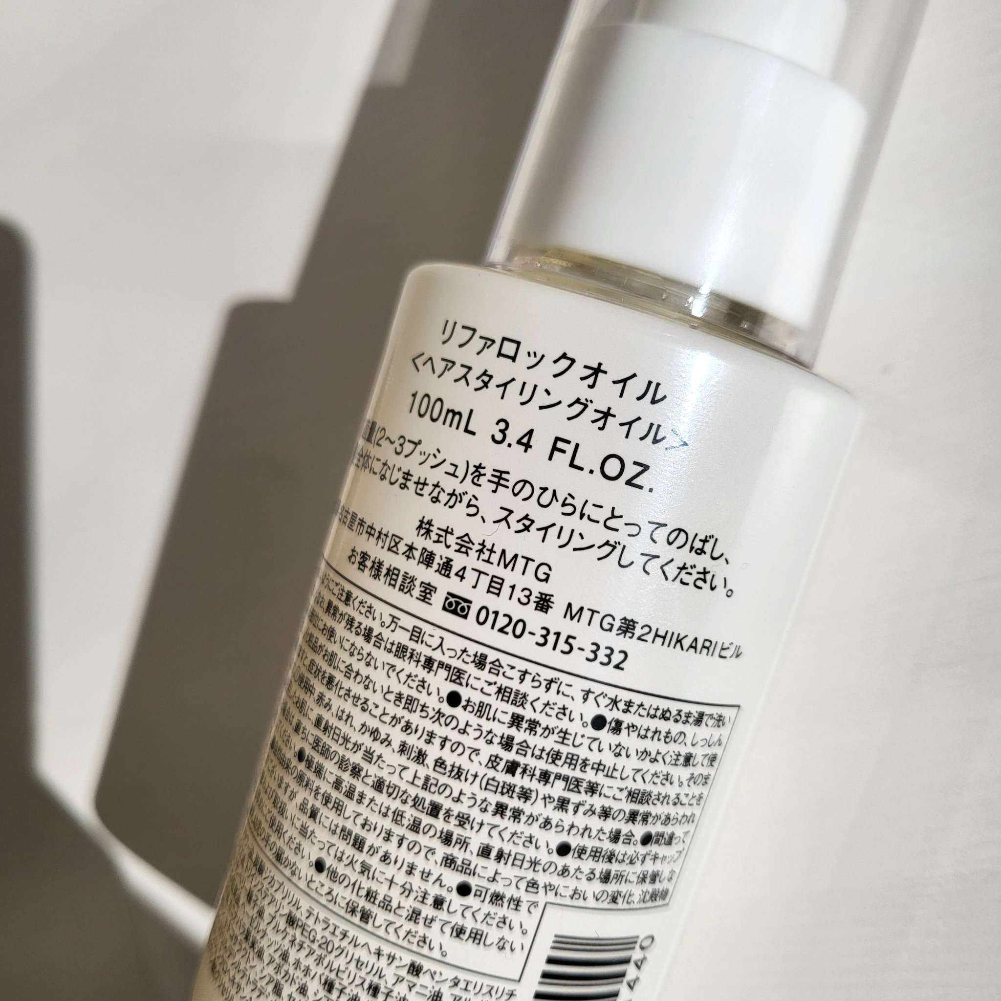 - 熱を味方にしなやかにロックし、ツヤめくスタイルがつづくオイル。 スタイリングの悩みに、アイロン前のワンステップ。 プロフェッショナルの熱コントロールに着想を得たメーカー独自の処方で、カールもストレートも、時間がたっても狙い通りのスタイルをロック。 髪表面を固めないので、驚くほどしなやかな指どおりとツヤを叶えます。 商品名 ReFa LOCK OIL リファロックオイル 品番 RC-AJ00A(リファロックオイル) 内容量 100mL ・本品は、日本国内にて、企画、開発を行っています。 ・「ReFa」は、(株) MTGの登録商標です。 2023年10月18日より新パッケージを発売/現行品取り扱い市場にて、随時切替