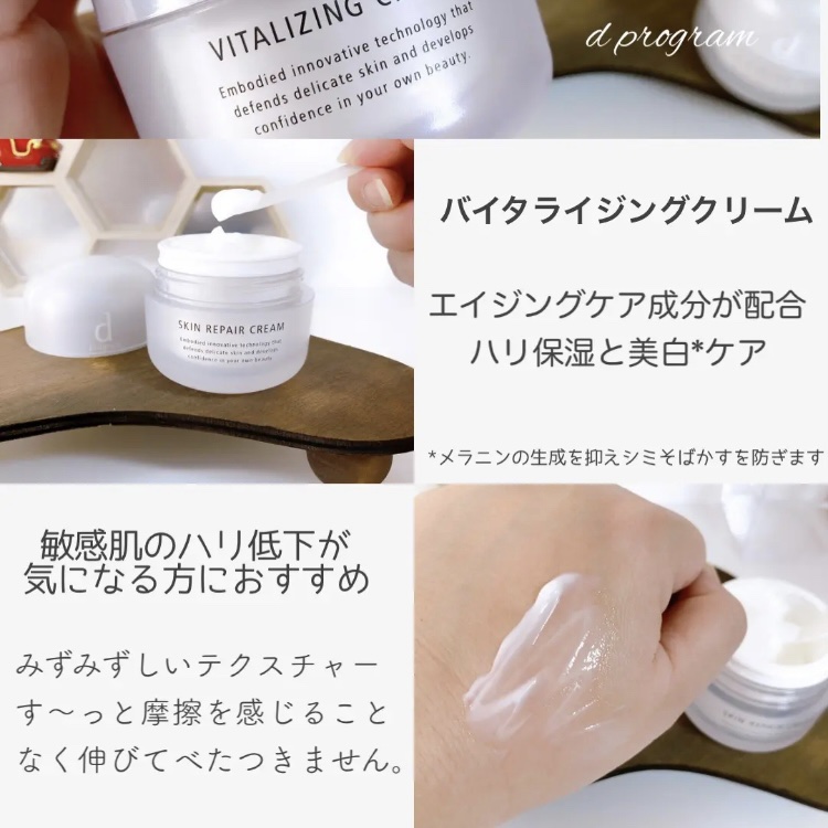 dプログラム🌿バイタライジングクリームハリ保湿ケア敏感肌用クリームベタつきがあまり感じられないクリーム敏感肌特有のハリ低下の要因にアプローチ。 肌にうるおいを届け、明るく、ふっくらとしたハリ肌へ導く薬用エイジングケア*クリームです。なめらかに...